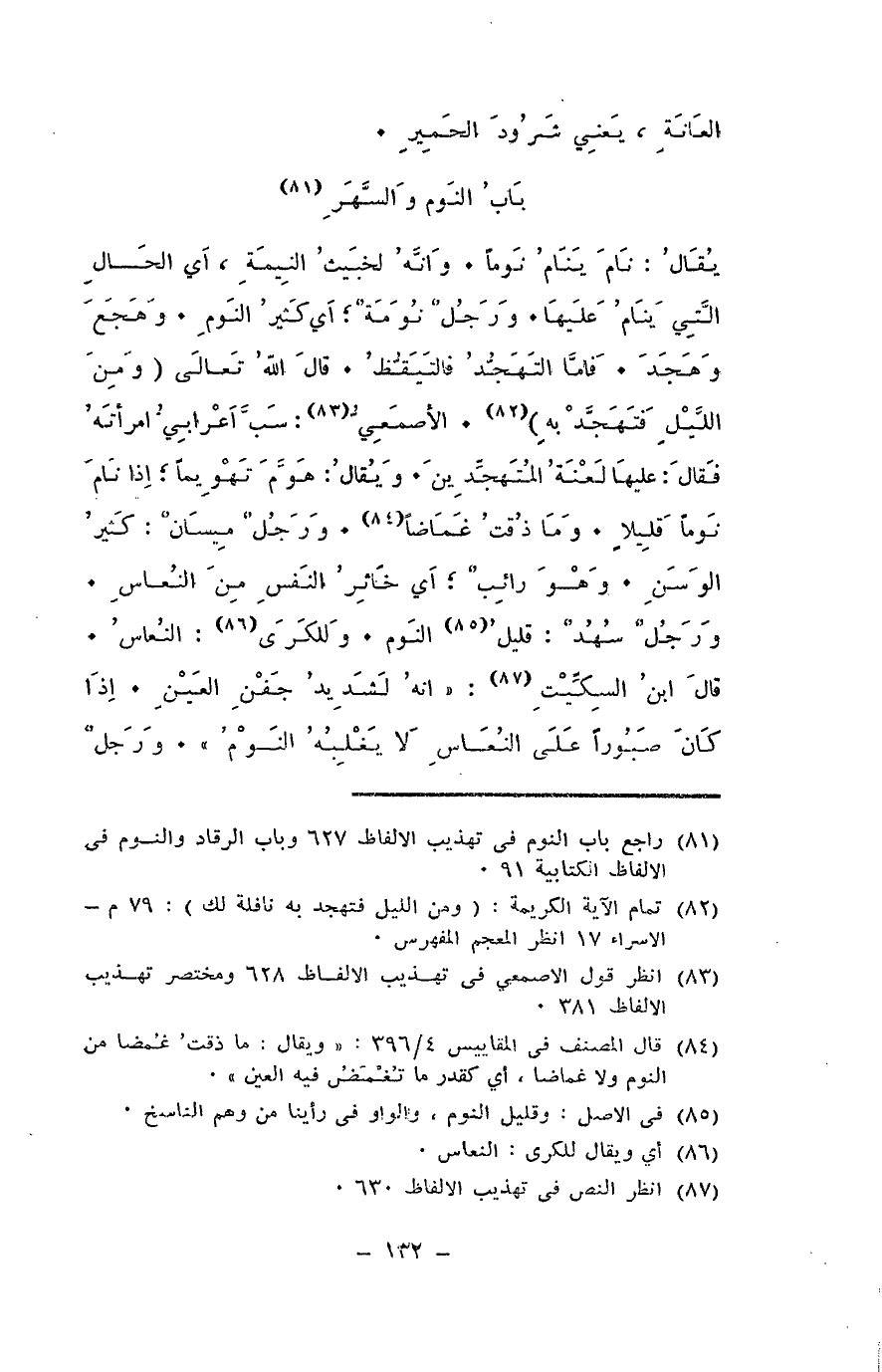 يقال: نام ينام نوما. وإنه لخبيب النِيمة، أي الحال التي ينام عليها. ورجل نُوَمة؛ أي كثير النوم. وهجع، وهجد. فأما التهجد فالتيقظ. قال الله تعالى: {ومن الليل فتهجد به}. الأصمعي: سب أعرابي امرأته فقال: عليها لعنةُ المتهجدين. ويقال: هَوَّم تهويما؛ إذا نام نوما قليلا. وما ذقت غماضا. ورجل مِيسَان: كثير الوسن. وهو رائب؛ أي خاثر النفس من النعاس. ورجل سُهُد: قليل النوم. وللكرى: النعاس. قال ابن السكيت: إنه لشديد جَفْنِ العين. إذا كان صبورا على النعاس لا يغلبُه النوم. ورجل