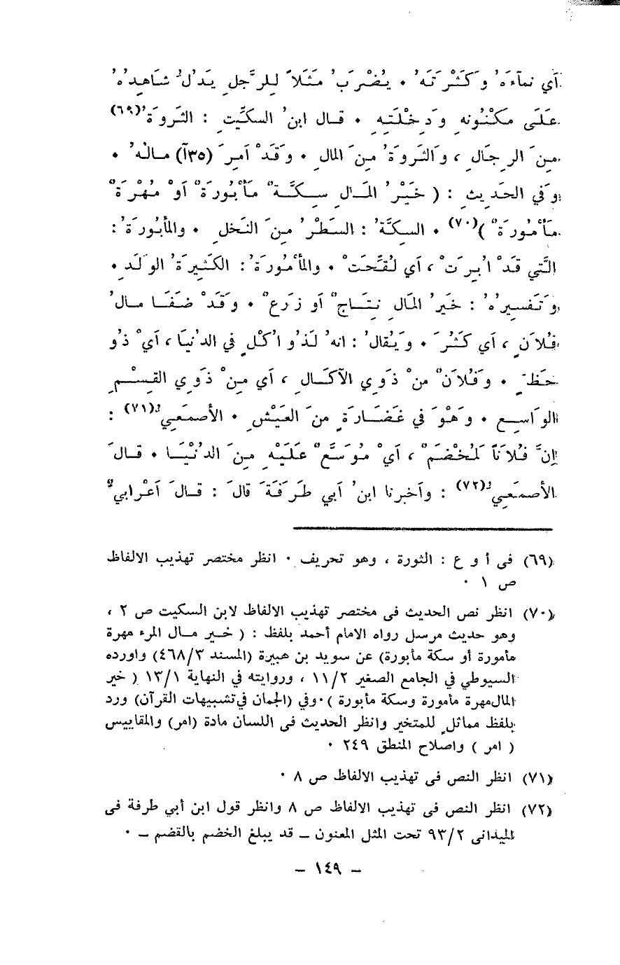 أي نماءه وكثرته. يضرب مثلا للرجل يدل شاهده على مكنونه ودخلته. قال ابن السكيت: الثروة من الرجال، والثروة من المال. وقد أمر ماله. وفي الحديث: خير المال سكة مأبورة أو مهرة مأمورة. السكة السطر من النخل. والمأبورة: التي قد أبرت، أي لقحت. والمأمورة: الكثيرة الولد. وتفسيره: خيرُ المال نتاج أو زرع. وقد ضفا مالُ فلان، أي كثر. ويقال: إنه لذو أكل في الدنيا، أي ذو حظ. وفلان من ذوي الآكال، أي من ذوي القسم الواسع. وهو في غضارةٍ من العيش. الأصمعي: إن فلانا لمُخضَم، أي موسَّع عليه من الدنيا. قال الأصمعي: وأخبرنا ابن أبي طرفة قال: قال أعرابي