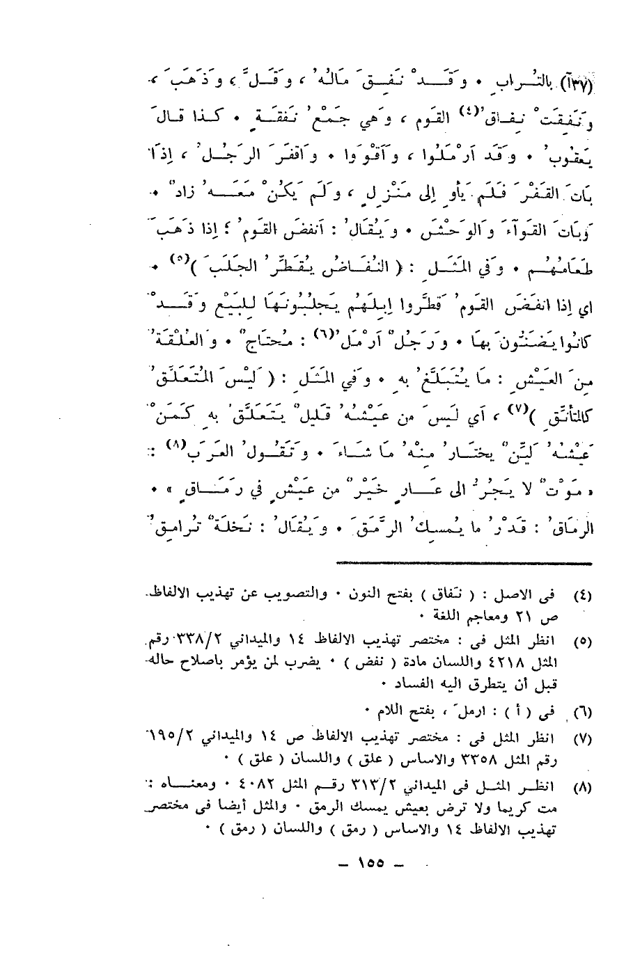 بالتراب. وقد نفق ماله، وقل، وذهب، ونفقت نفاقُ القوم، وهي جمع نفقة. كذا قال يعقوب. وقد أرملوا وأقووا. وأقفر الرجل، إذا بات القفر فلم يأوِ إلى منزل، ولم يكن معه زاد. وبات القواء والوحش. ويقال: أنفض القومُ؛ إذا ذهب طعامهم. وفي المثل: النُفاض يقطّر الجلب. أي إذا أنفض القوم قطّروا إبلَهم يجلبونها للبيع وقد كانوا يضَنون بها. ورجل أرمل محتاج. والعلقة من العيش: ما يتبلغ به. وفي المثل: ليس المتعلّق كالمتأنق، أي ليس من عيشه قليل يتعلق به كمن عيشه لين يختار منه ما شاء. وتقول العرب: موتٌ لا يجر إلى عار خير من عيش في رماق. الرماق: قدر ما يمسك الرمق. ويقال: نخلة ترامق