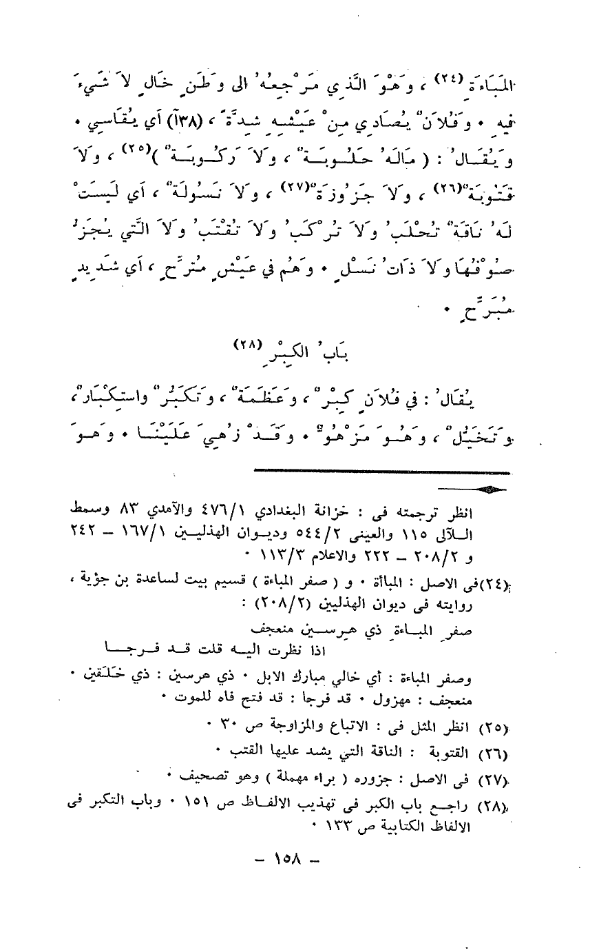 المباءة، وهو الذي مرجعه إلى وطن خال لا شيء فيه. وفلان يصادي من عيشه شدة، أي يقاسي. ويقال: ما له حلوبة ولا ركوبة، ولا قتوبة ولا جزوزة، ولا نسولة، أي ليست له ناقة تحلب ولا تركب ولا تقتب ولا التي يُجز صوفها ولا ذات نسل. وهم في عيش مُترّح، أي شديد مبرح.
