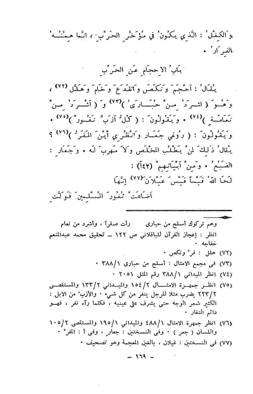 يقال: أحجم ونكص وانقدع وخام وهلَّل، وهو أشردُ من حُبارى، وأشرد من نعامة. ويقولون: كل أزَبَّ نَفُور. ويقولون: رُوغي جَعارِ وانظري أين المفرُّ. يقال ذلك لمن يطلب المخلَص ولا مهرب له. وجَعارِ: الضبعُ. ومن أبياتهم: