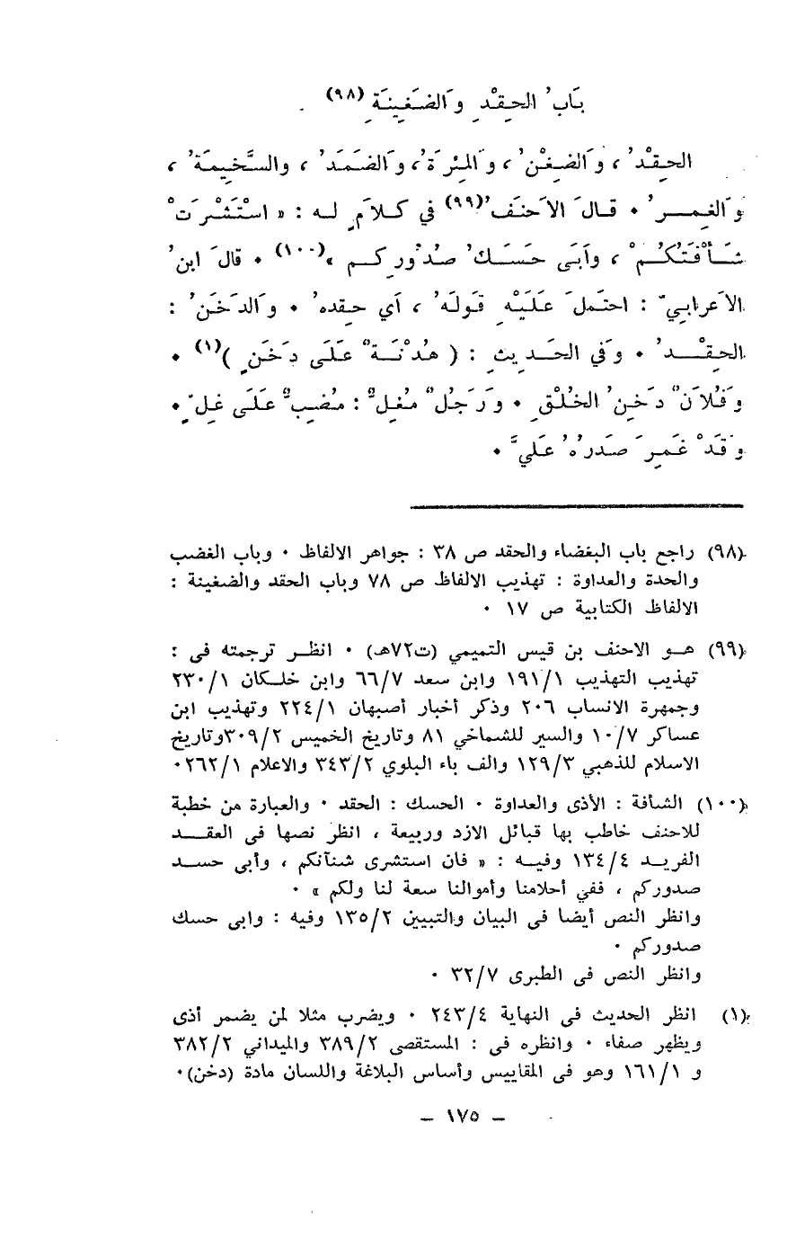 الحقد والضغن والمِئْرة، والضَمَد، والسخيمة والغِمْر. قال الأحنف في كلام له: استشرَتْ شأفتُكم وأبى حَسَكُ صدوركم. قال ابن الأعرابي: احتمل عليه قولَه، أي حقده. والدَخَن: الحقد. وفي الحديث: هُدنة على دخن. وفلان دخِن الخلق. ورجل مُغِلّ: مُضِبّ على غل. وقد غمر صدرُه عليَّ.
