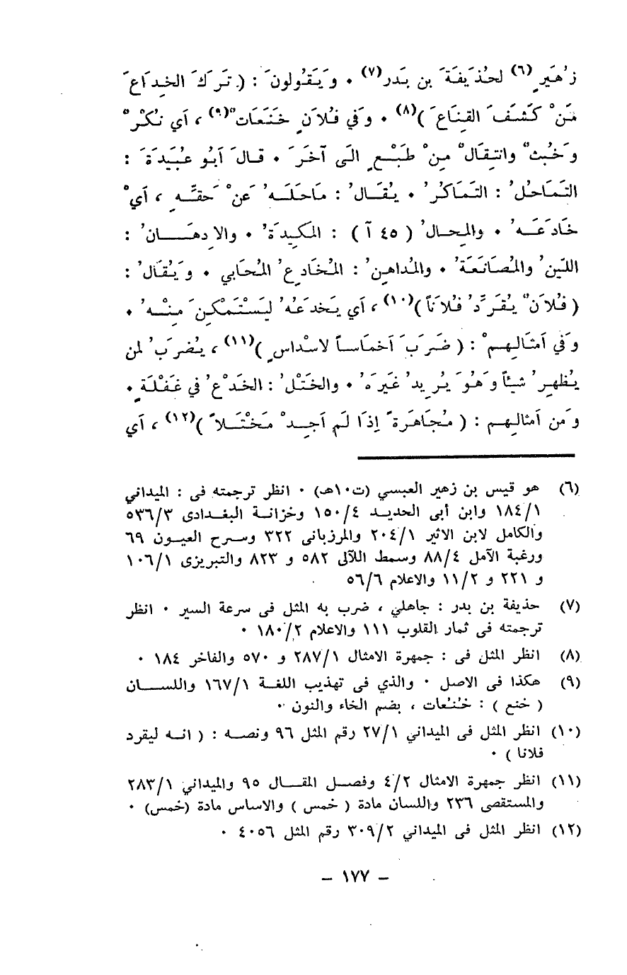 زهير لحذيفة بن بدر. ويقولون: ترك الخداع من كشف القناع. وفي فلان خنعاتٌ، أي نكر وخبث وانتقال من طبع إلى آخر. قال أبو عبيدة: التماحل التماكر. يقال: ماحله عن حقه، أي خادعه. والمِحال: المكيدة. والإدهان: اللين والمصانعة. والمداهن: المخداع المحابي. ويقال: فلان يقرّد فلانا، أي يخدعه ليستمكن منه. وفي أمثالهم: ضرب أخماسا لأسداس، يضرب لمن يظهر شيئا وهو يريد غيره. والختل: الخدع في غفلة. ومن أمثالهم: مجاهرة إذا لم أجد مختلا، أي