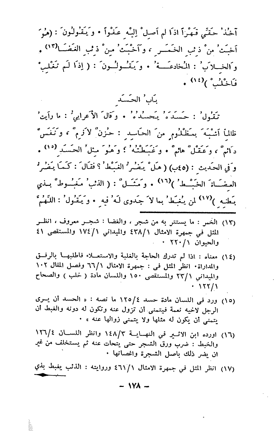 تقول: حسده يحسُده. وقال الأعرابي: ما رأيت ظالما أشبه بمظلوم من الحاسد: حزن لازم، ونفس دائم، وعقل هائم. وغبَطته، وهو مثل الحسد. وفي الحديث: هل يضر الغَبْط؟ فقال: كما يضر العضاهَ الخبطُ. ومثلٌ: الذئب مغبوطٌ بذي بطنه، لمن يغبط بما لا جدوى له فيه. ويقول: اللهم