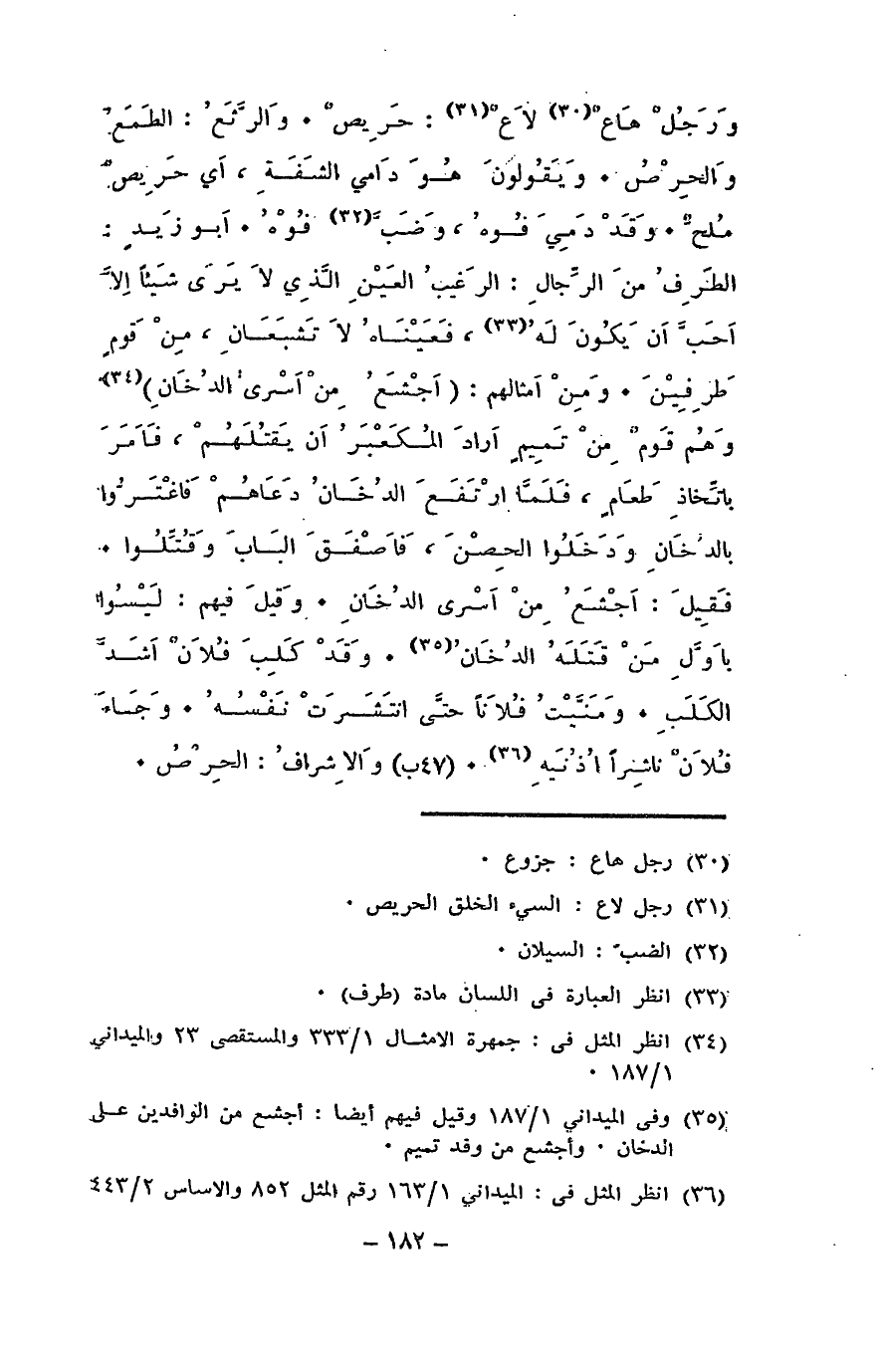 ورجل هاعٌ لاعٌ: حريص. والرثَع: الطمع والحرصُ. ويقولون: هو دامي الشفة، أي حريص مُلِحّ. وقد دمي فوه، وضب فوه. أبو زيد: الطَرِف من الرجال: الرغيب العين الذي لا يرى شيئا إلا أحب أن يكون له، فعيناه لا تشبعان، من قوم طرِفين. ومن أمثالهم: أجشع من أسرى الدخان، وهم قوم من تميم أراد المكعبر أن يقتلهم، فأمر باتخاذ طعام، فلما ارتفع الدخان دعاهم، فاغتروا بالدخان ودخلوا الحصن، فأصفق الباب وقُتِّلوا. فقيل: أجشع من أسرى الدخان. وقيل فيهم: ليسوا بأول من قتله الدخان. وقد كلِبَ فلانٌ أشدَّ الكلَب. ومنَّيتُ فلانا حتى انتشرت نفسُه. وجاء فلان ناشرا أذنيه. والإشراف الحرص.