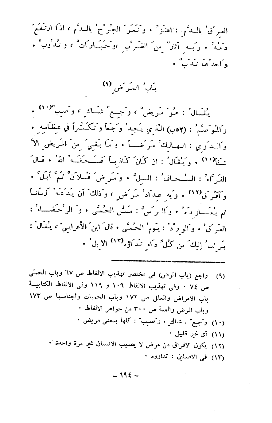 يقال: هو مريض، وجع شاكٍ، وصب. والموصّم: الذي يجد وجعا وتكسرا في عظامه. والدوِي: الهالك مرضا. وما بقي من المرض إلا شفا. ويقال: إن كان كاذبا فسحفه الله. قال الفراء: السُحاف: السل. ومرض فلان ثم أبل. وأفرق. وبه عداد مرض، وذلك أن يدعه زمانا ثم يعاوده. والرس: مس الحمى. والرحضاء: العرق. والورد: يوم الحمى. قال ابن الأعرابي: يقال: برئت إليك من كل داء تداؤه الإبلُ.