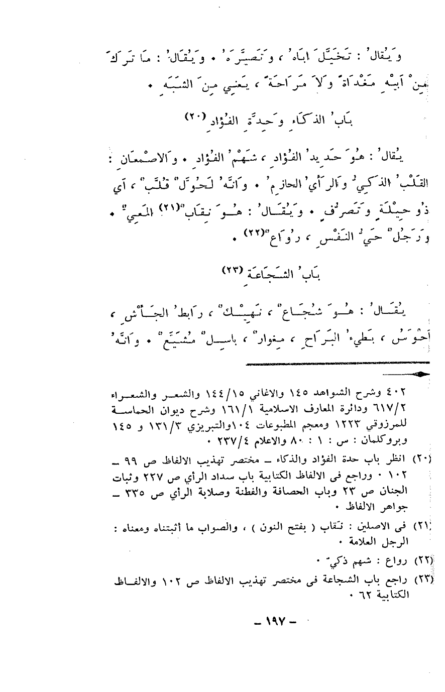يقال: هو حديد الفؤاد، شهم الفؤاد. والأصمعان: القلب الذكي والرأي الحازم. وإنه لحول قلب، أي ذو حيلة وتصرف. ويقال: هو نِقَاب ألمعيّ. ورجل حي النفس، رُواع.