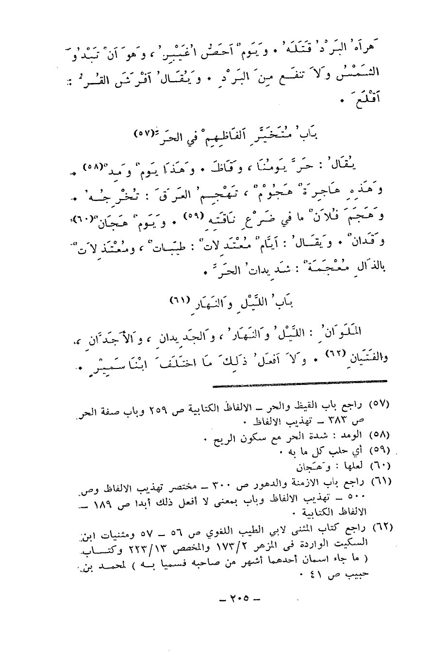 يقال: حر يومنا، وقاظ. وهذا يوم ومِدٌ. وهذه هاجرة هجوم، تهجِم العرَق: تخرجه. وهجم فلانٌ ما في ضرعِ ناقته. ويوم هَجَانٌ، وقدانٌ. ويقال: أيام معتدلات: طيبات، ومعتذلات بالذال معجمة: شديدات الحر.