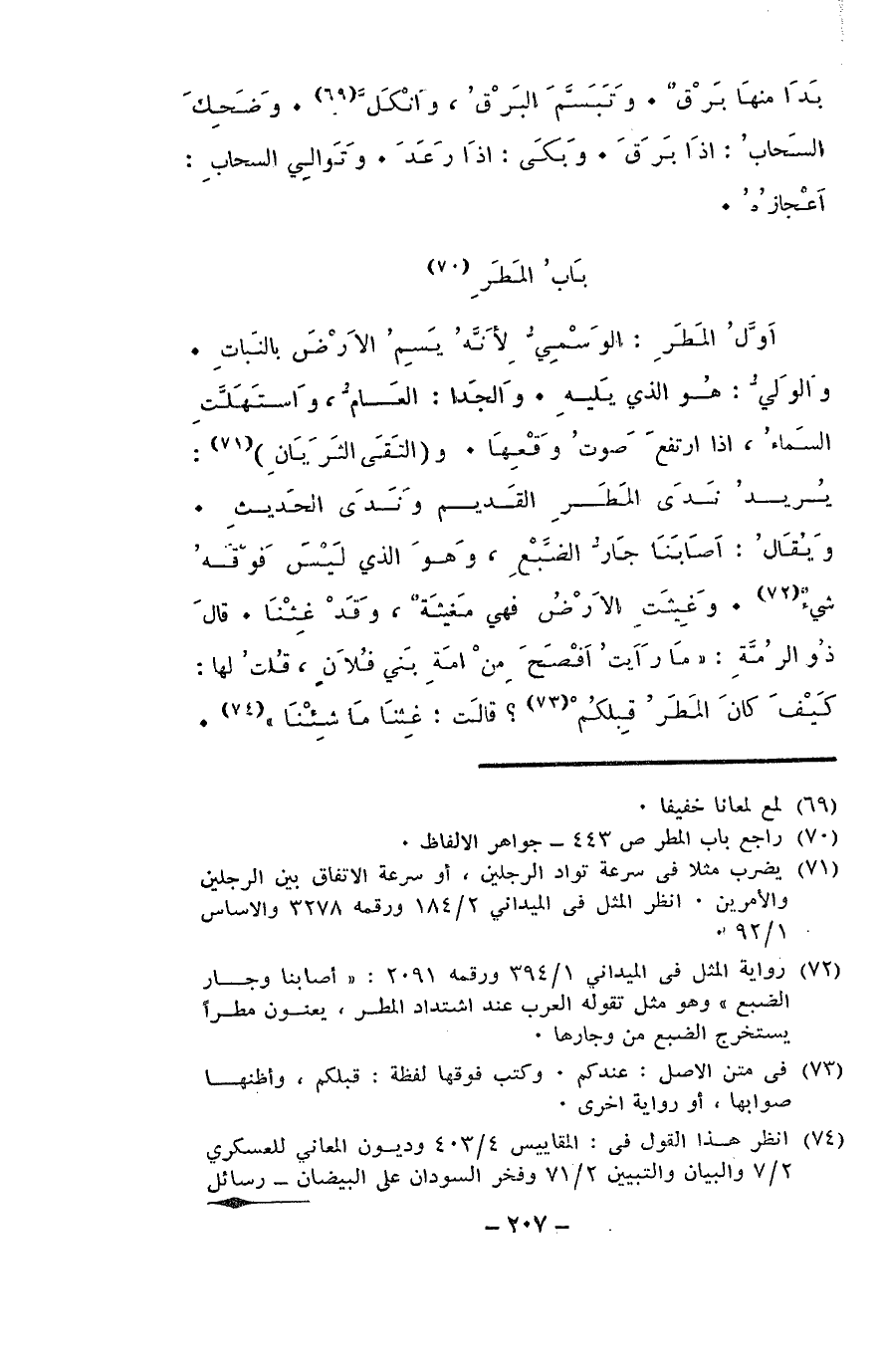 أول المطر الوسمي لأنه يسم الأرض بالنبات. والوَلِيّ: هو الذي يليه. والجدا: العام، واستهلّت السماء إذا ارتفع صوتُ وقعها. والتقى الثَرَيان: يريد ندى المطر القديم وندى الحديث. ويقال: أصابنا جارُّ الضبع، وهو الذي ليس فوقه شيء. وغِيثَت الأرضُ فهي مغيثة، وقد غثنا. قال ذو الرمة: ما رأيت أفصح من أمة بني فلان، قلت لها: كيف كان المطر قبلكم؟ قالت: غثنا ما شئنا.