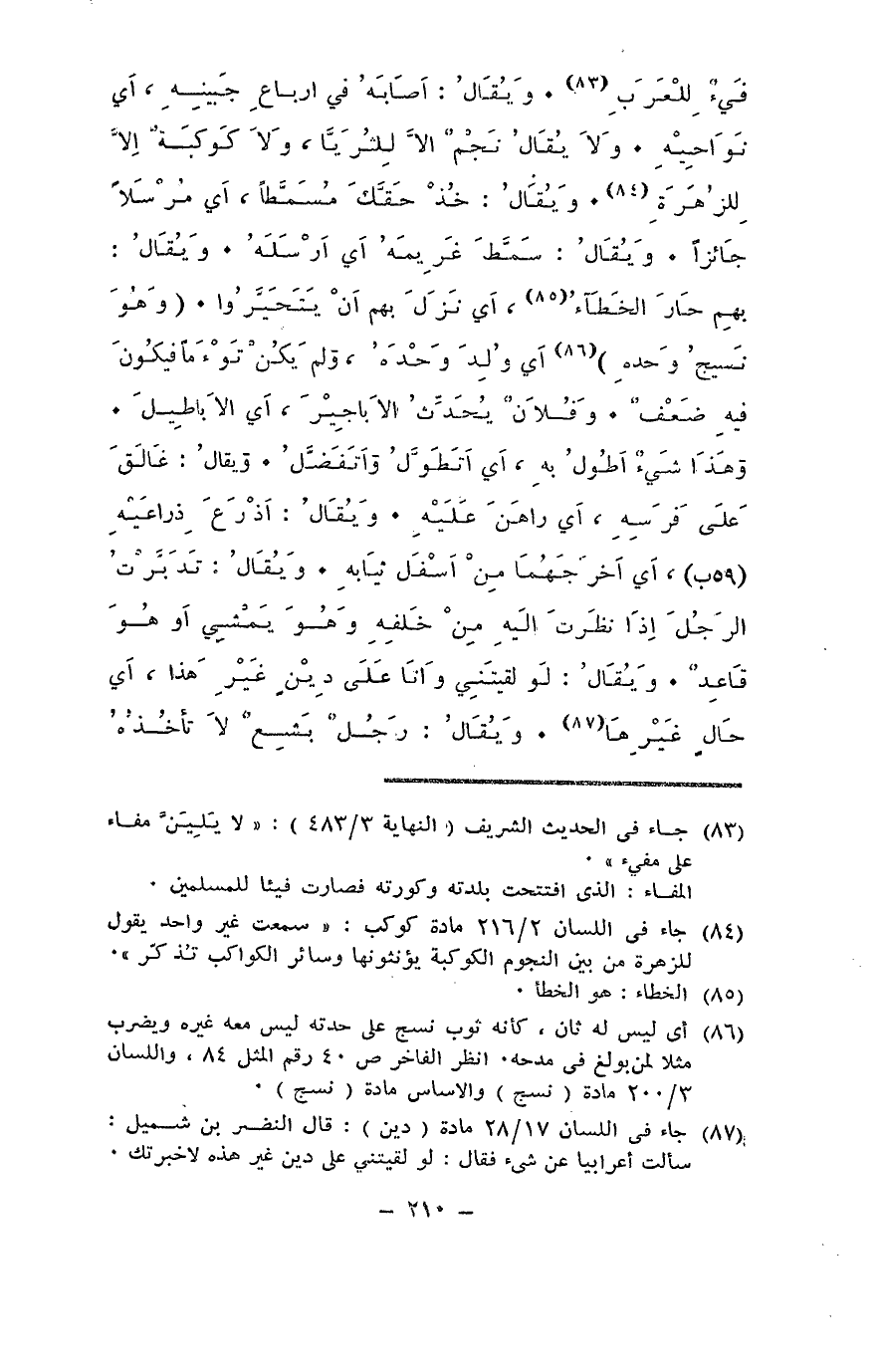 فيء للعرب. ويقال: أصابه في أرباع جبينه، أي نواحيه. ولا يقال نجم إلا للثريا، ولا كوكبةٌ إلا للزهرة. ويقال: خذ حقك مسمّطا، أي مرسلا جائزا. ويقال: سمّط غريمه أي أرسله. ويقال: بهم حارَ الخطاءُ، أي نزل بهم أن يتحيروا. وهو نسيجُ وحده أي وُلِد وحده، ولم يكن توءما فيكون فيه ضعف. وفلان يحدِّث الأباجيرَ، أي الأباطيل. وهذا شيء أطُول به، أي أتطول وأتفضل. ويقال: غالق على فرسه، أي راهن عليه. ويقال: أذرعَ ذراعيه: أي أخرجهما من أسفل ثيابه. ويقال: تدبّرت الرجل إذا نظرت إليه من خلفه وهو يمشي أو هو قاعد. ويقال: لو لقيتني وأنا على دِين غير هذا، أي حال غيرها. ويقال: رجل بشع لا تأخذه
