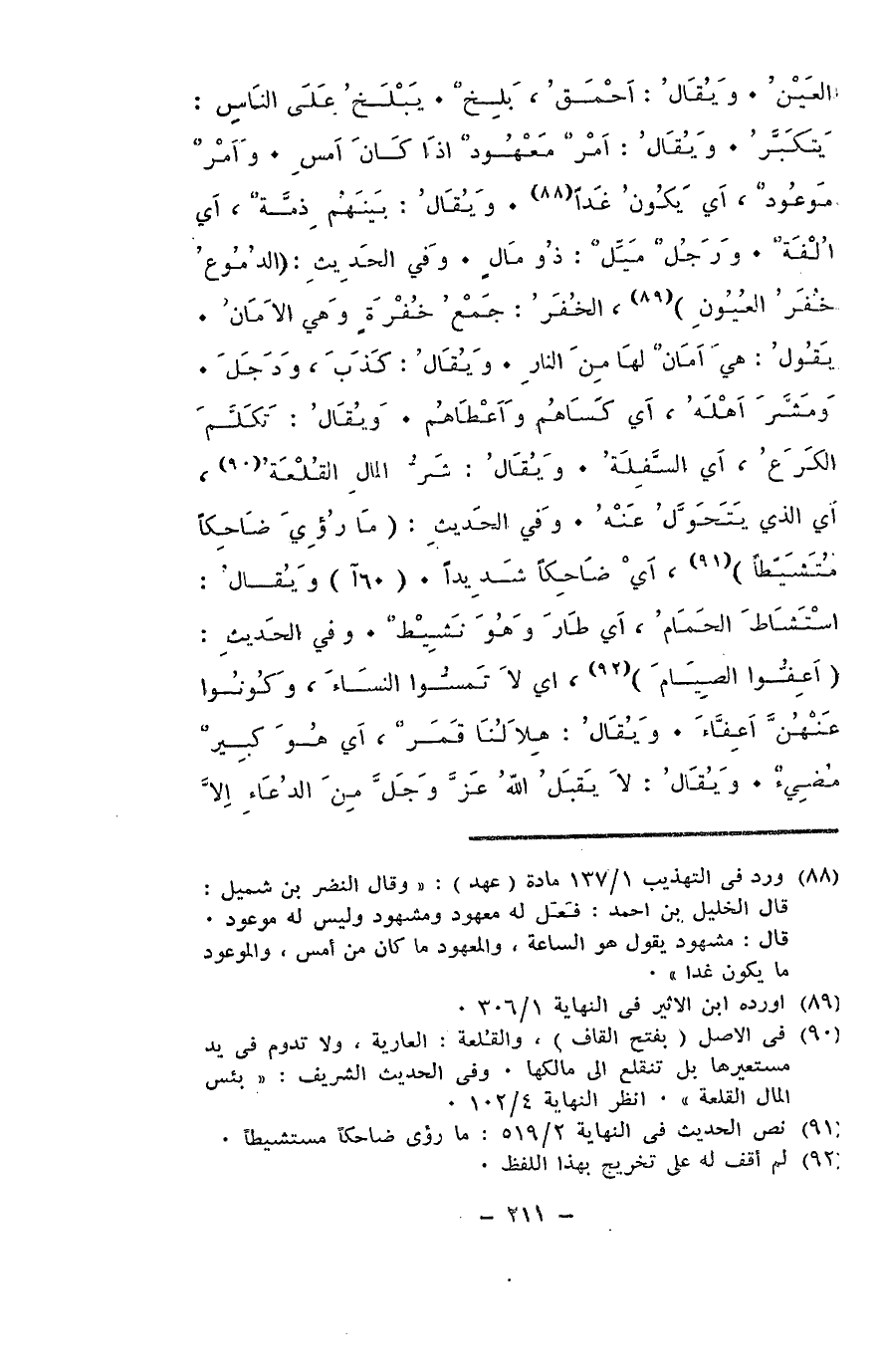 العين. ويقال: أحمق، بلخ. يبلخ على الناس: يتكبر. ويقال: أمر معهود إذا كان أمس. وأمر موعود، أي يكون غدا. ويقال: بينهم ذمة، أي أُلفة. ورجل ميِّل: ذو مال. وفي الحديث: الدموع خُفَرُ العيون، الخفر: جمع خفرة وهي الأمان. يقول: هي أمان لها من النار. ويقال: كذب، ودجل. ومشّر أهلَه، أي كساهم وأعطاهم. ويقال: تكلم الكَرَعُ، أي السفِلة. ويقال: شر المال القُلْعة، أي الذي يتحول عنه. وفي الحديث: ما رؤي ضاحكا مشيطا، أي ضاحكا شديدا. ويقال: استشاط الحمام، أي طار وهو نشيط. وفي الحديث: أعفوا الصيام، أي لا تمسوا النساء، وكونوا عنهن أعفاء. ويقال: هلالُنا قَمَر، أي هو كبير مضيء. ويقال: لا يقبل الله عز وجل من الدعاء إلا