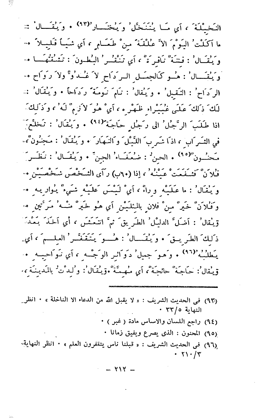 النَخِيلة، أي ما يتنخل ويختار. ويقال: ما أكلت اليوم إلا علقة من طعام، أي شيئا قليلا. ويقال: فتنة ناقرة، أي تنقر البطون: تشقها. ويقال: هو كالخمل الرداح لا غدو ولا رواح. الرداح الثقيل، ويقال: نام نومة رداحا. ويقال: لك ذلك على غبيراء ظهره، أي هو لازم له، وذلك إذا طلب الرجل إلى رجل حاجةً. ويقال: تخلع في الشراب، إذا شرب الليل والنهار. ويقال: مجنون محنون. الحن: ضعفاء الجن. ويقال: نظر فلان فشفعت عينُه، إذا رأى الشخصَ شخصين. ويقال: ما عليه وِراءٌ، أي ليس عليه شيء يواريه. وفلان خيرٌ من فلان بالمثلين أي هو خير منه مرتين. ويقال: أضلَّ الدليلُ الطريقَ ثم انتعش، أي أخذ بعدَ ذلك الطريق. ويقال: هو يتقفّر العلمَ، أي يطلبه. وهو جميلُ دوائر الوجه، أي نواحيه. ويقال: حاجةٌ حائجة، أي مهمة. ويقال: ولدت بالمدينة