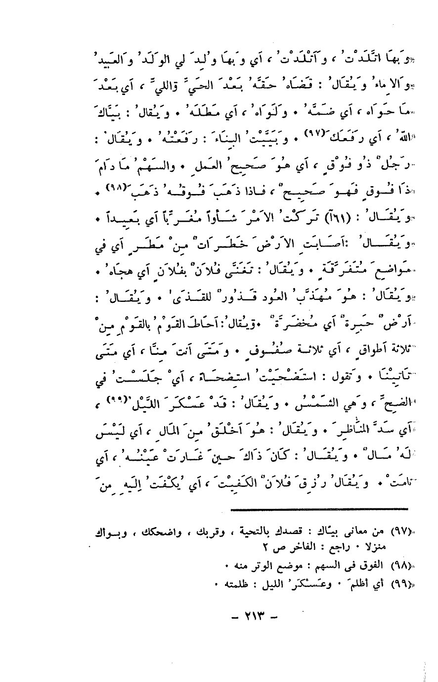 وبها اتّلدت، وأتلدتُ، أي وبها ولد لي الولد والعبيدُ والإماءُ ويقال: قضاه حقه بعد الحي واللي، أي بعد ما حواه أي ضمه. ولوه، أي مطله. ويقال: بياك الله، أي رفعك. وبييت البناء: رفعته. ويقال: رجل ذو فُوق، أي هو صحيح العمل. والسهم ما دام ذا فوق فهو صحيح، فإذا ذهب فوقه ذهب. ويقال: تركتُ الأمر شأوا مغرّبا أي بعيدا. ويقال: أصابت الأرضَ خطرات من مطر أي في مواضع متفرقة. ويقال: تغنى فلان بفلان، أي هجاه. ويقال: هو مهذّب العود قذور للقذى. ويقال: أرض حبِرة أي مخضرَّة. ويقال: أحاط القومُ بالقوم من ثلاثة أطواق، أي ثلاثة صفوف. ومتى أنت منا، أي متى تأتينا. وتقول: استضحيتُ استضحاءً، أي جلستُ في الضح، وهي الشمس. ويقال: قد عسكر الليل، أي سد المناظر. ويقال: هو أخلقُ من المال، أي ليس له مال. ويقال: كان ذاك حين غارت عينُه، أي نامت. ويقال: رُزِق فلان الكَفِيتَ، أي يكفت إليه من