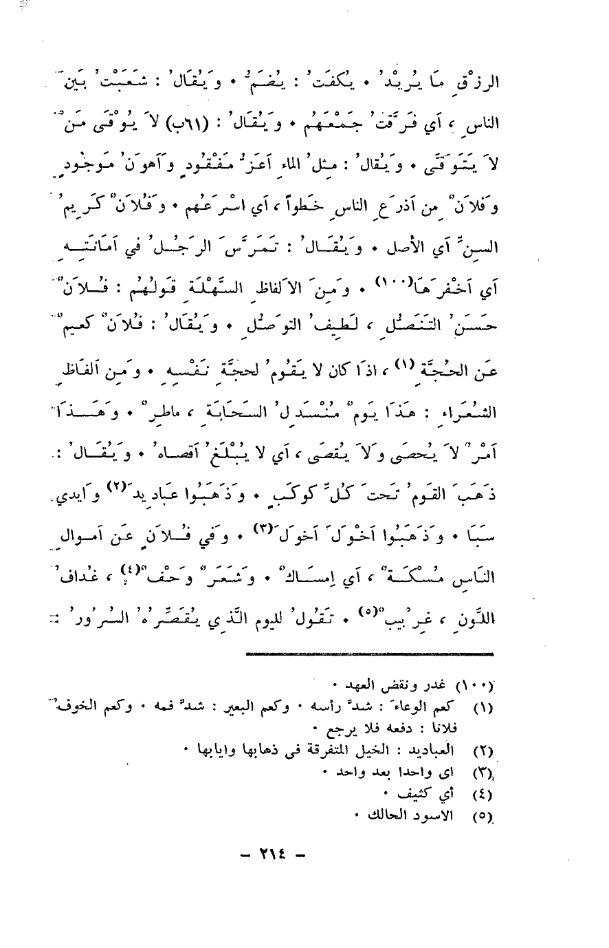 الرزق ما يريد. يكفت: يضم. ويقال: شعَبتُ بين الناس، أي فرّقت جمعَهم. ويقال: لا يوقَى من لا يتوقى. ويقال: مثلُ الماء أعزُّ مفقود وأهون موجود. وفلان من أذرع الناس خطوا، أي أسرعهم. وفلان كريم السن أي الأصل. ويقال: تمرّس الرجل في أمانته أي أخفرها. ومن الألفاظ السهلة قولهم: فلان حسن التنصل لطيف التوصل. ويقال: فلان كعيم عن الحجة، إذا كان لا يقوم لحجة نفسه. ومن ألفاظ الشعراء: هذا يوم منسدل السحابة، ماطر. وهذا أمر لا يُحصى ولا يقصى، أي لا يبلغ أقصاه. ويقال: ذهب القوم تحت كل كوكب. وذهبوا عباديد وأيدي سبا. وذهبوا أخولَ أخولَ. وفي فلان عن أموال الناس مُسكة، أي إمساك. وشعر وَحْفٌ، غداف اللون، غربيب. تقول لليوم الذي يقصّره السرور