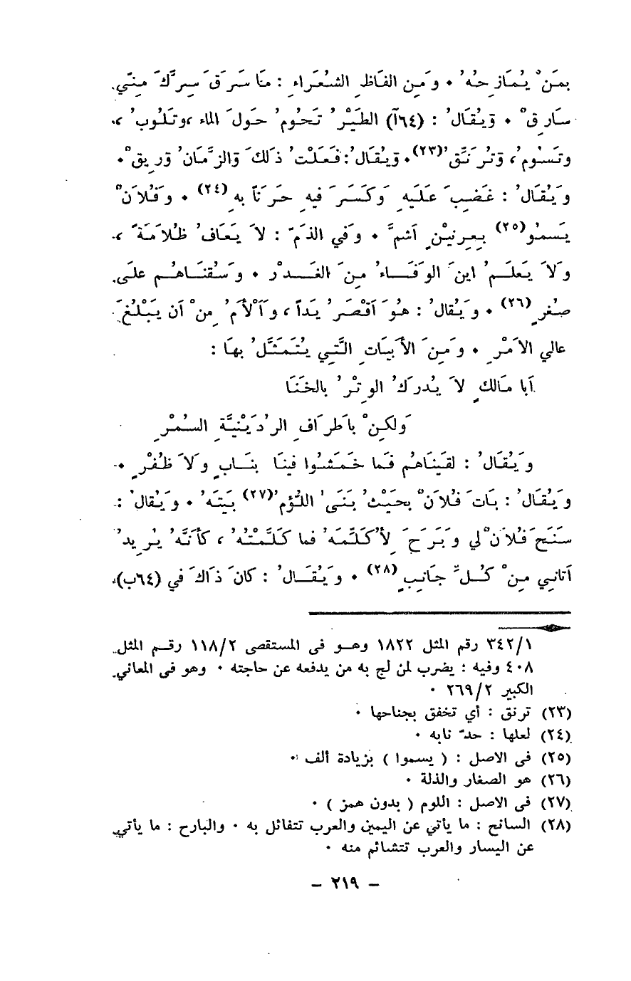 بمن يمازحه. ومن ألفاظ الشعراء: ما سرق سرك مني سارق. ويقال: الطير تحوم حول الماء، وتلوب، وتسوم، وترنّق. ويقال: فعلت ذلك والزمان وريق. ويقال: غضِب عليه وكسر فيه حرَنا به. وفلان يسمو بعرنين أشم. وفي الذم: لا يعاف ظلامةً، ولا يعلم أين الوفاء من الغدر. وسقناهم على صُغر. ويقال: هو أقصر يدا وألأم من أن يبلغ عالي الأمر. ومن الأبيات التي يتمثل بها: