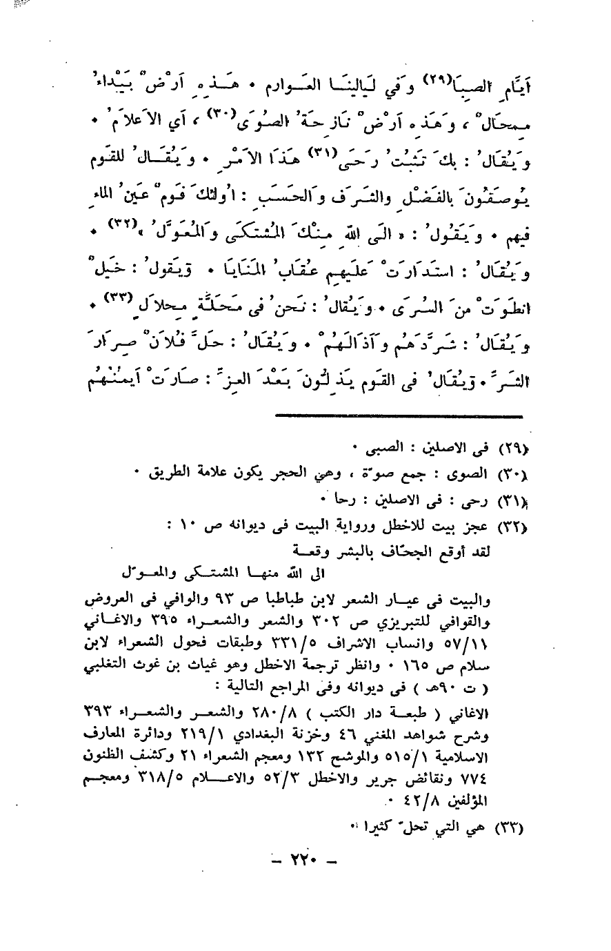 أيام الصبا وفي ليالينا العوارم. هذه أرضٌ بيداءُ ممحال، وهذه أرض نازحة الصوى، أي الأعلام. ويقال: بك تثبت رحى هذا الأمر. ويقال للقوم يوصفون بالفضل والشرف والحسب: أولئك قوم عينُ الماء فيهم. ويقول: إلى الله منك المشتكى والمعوّل. ويقال: استدارت عليهم عقاب المنايا. ويقول: خيلٌ انطوت من السرى. ويقال: نحن في محلّة محلال. ويقال: شرّدهم وأذالهم. ويقال: حل فلان صرار الشر. ويقال في القوم يذلون بعد العز: صارت أيمنهم