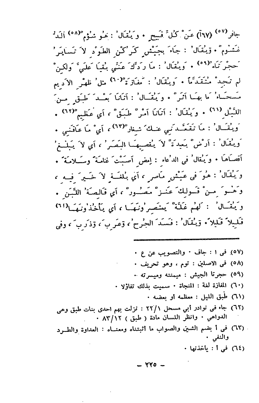 جافر عن كل قبيح. ويقال: هو شؤم ألدّ غشوم. ويقال: جاء بجيش كرُكْن الطود لا تَسايَرُ حجْرتاه. ويقال: ما ردك عني بُقيا عليَّ، ولكن لم تجد مُتقدَّما. ويقال: مفازة مثل ظهر الأديم مَسْحاءُ ما بها أثر. ويقال: أتانا بعد طبق من الليل. ويقال: أتانا أمرٌ طَبَقٌ، أي عظيم. ويقال: ما تقعَّدني عنك شِغار، أي ما عاقني. ويقال: أرض بعيدة لا يُقصِيها البصرُ، أي لا يبلغ أقصاها. ويقال في الدعاء: امض أصبتَ غنامةً وسلامةً. ويقال: هو في عيش ماصر، أي بلغة لا خير فيه، وهو من قولك عَنْز مصور، أي قالصة اللبن. ويقال: لهم غَلَّة يمتصرونها، أي يأخذونها قليلا قليلا. ويقال: فسد الجرح، وعَرِبَ، وذَرِبَ، وفي