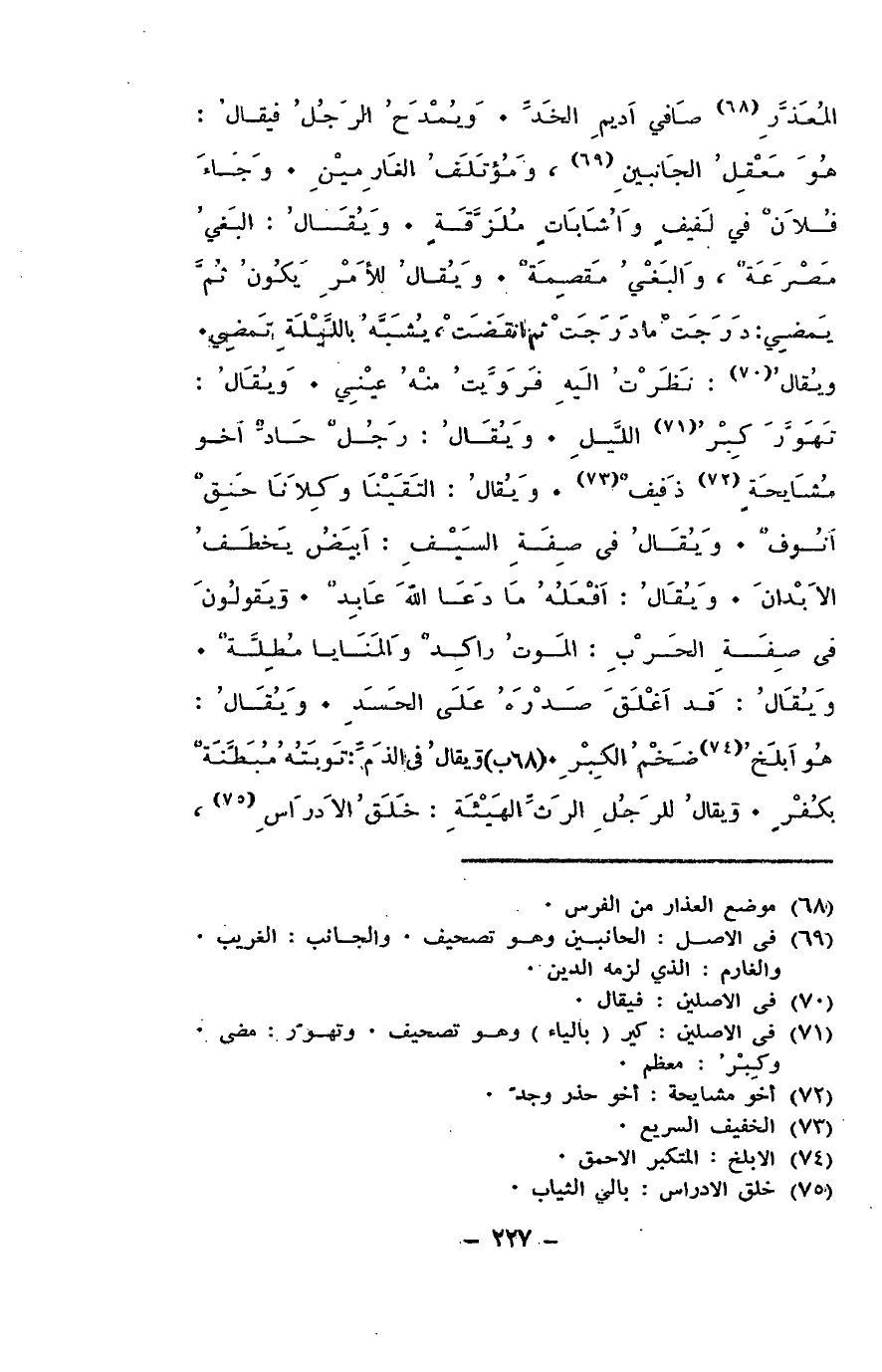 المعذَّّر، صافي أديم الخد. ويُمدَحُ الرجل فيقال: هو معقِل الجانبين، ومؤتلف الغارمين. وجاء فلان في لفيفٍ وأشاباتٍ ملزَّقة. ويقال: البغيُ مَصْرَعَةٌ، والبغيُ مقصِمة. ويقال للأمر يكون ثم يمضي: درجتْ ما درجت ثم انقضت، يُشَبَّه بالليلة تمضي. ويقال: نظرتُ إليه فروَّيت منه عيني. ويقال: تهوَّر كبرُ الليل. ويقال: رجل حادّ أخو مشايحة ذفيف. ويقال: التقينا وكلانا حنِق أنوف. ويقال في صفة السيف: أبيضُ يخطَف الأبدان. ويقال: أفعلُه ما دعا اللهَ عابدٌ. ويقولون في صفة الحرب: الموت راكد والمنايا مُطِلّة. وأيضا: قد أغلقَ صدرَه على الحسد. ويقال: هو أبلخُ ضخمُ الكِبْر. ويقال في الذم: توبته مُبطّنة بكفر. ويقال للرجل الرث الهيئة: خَلَقُ الأدراس