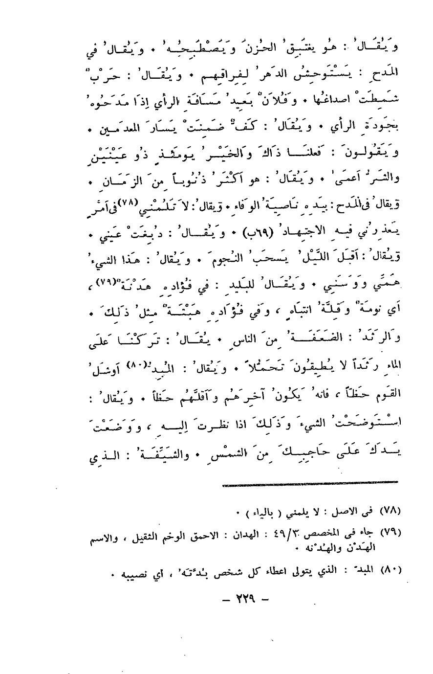 ويقال: هو يغتبق الحزنَ ويصطحبه. ويقال في المدح: يستوحش الدهرُ لفراقهم. ويقال: حربٌ شمِطت أصداغها. وفلان بعيد مسافة الرأي إذا مدحوه بجودة الرأي. ويقال: كف ضمنت يسارَ المعدمين. ويقولون: فعلنا ذاك والخيرُ يومئذ ذو عينين والشر أعمى. ويقال: هو أكثر ذنوبا من الزمان. ويقال في المدح: بيده ناصيةُ الوفاء. ويقال: لا تلمني في أمر يعذرني فيه الاجتهادُ. ويقال: دُبِغت عيني. ويقال: أقبل الليلُ يسحب النجوم. ويقال: هذا الشيء همي ووسني. ويقال للبليد: في فؤاده هَدْنَة، أي نومة وقلة انتباه، وفي فؤاده هَبْتَة مثل ذلك. والرثد: الضعَفَة من الناس. يقال: تركنا على الماء رَثَدا لا يطيقون تحملا. ويقال: المُبِدّ أوشلُ القوم حظا، فإنه يكون آخرهم وأقلهم حظا. ويقال: استوضحتُ الشيءَ وذلك إذا نظرتَ إليه، ووضعتَ يدك على حاجبك من الشمس. والشَيِّفَة: الذي
