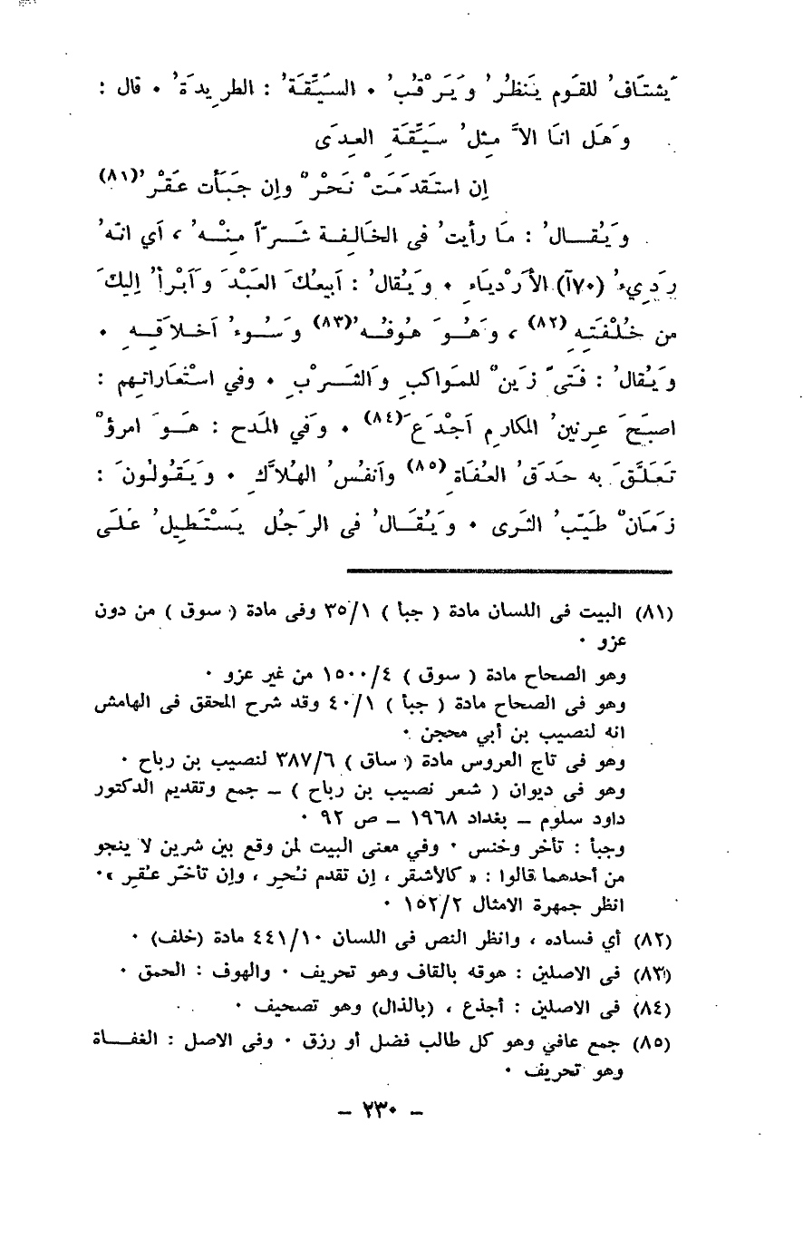ويقال: ما رأيتُ في الخالفة شرا منه، أي أنه رديء الأردياء. ويقال: أبيعك العبد وأبرأ إليك من خُلْفته، وهو هُوفُه وسوء أخلاقه. ويقال: فتى زين للمواكب والشرب. وفي استعاراتهم: أصبح عرنينُ المكارم أجدعَ. وفي المدح: هو امرؤ تعلّقَ به حَدَق العفاة وأنفُس الهُلاَّك. ويقولون: زمان طيّبُ الثرى. ويقال في الرجل يستطيل على