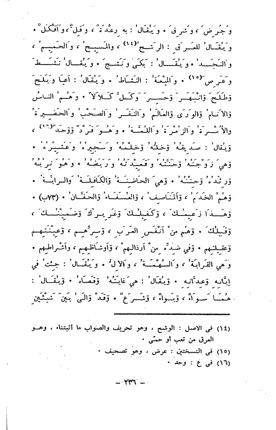 وجَرِض وشرق. ويقال: به رِعدة، وقِل، وأفكل. ويقال للعَرَق: الرشح، والمسيح، والحميم، والنجَد. ويقال: بكى ونشج. ويقال: نشط وعرِص. والميعة: النشاط. ويقال: أعيا وبَلَحَ وطلَح وانبهر وحسِر وكل كلالا. وهم الناس والأنام والورى والعالم والنفر والصحب والحضيرة والأسرة والزمرة واللُّمة. وهو فرد ووحد. ويقال: صديقُه وخله وخلمه وسجيره وعشيره، وهي زوجته وحنته وقعيدته وربضه. وهو تربه ورئده وحِتنه. وهي الحاضنة والكافلة والرابة. وهم الخدم والمناصف، والعسفاء والحَفان. وهذا زعيمك وكفيلك وغريرك وضمينك، وقبيلك. وهم من أنفس العرب، وسرهم، وعينتهم، وعقيلتهم. وفي ضده من أرذالهم، وأوشاظهم، وأشراطهم. وهي القرابة والسهمة والإل. ويقال: جئت في إبانه وعدانه. ويقال: هي غايته وقصاه. ويقال: هما سواء، وبواء، وشرع. وقد والى بين شيئين