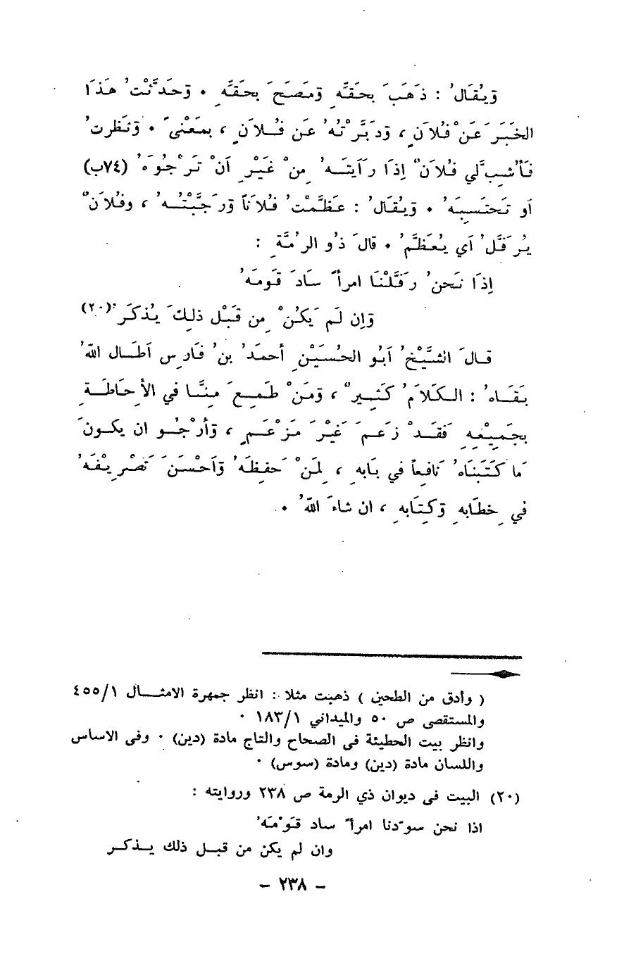 قال الشيخ أبو الحسين أحمد بن فارس أطال الله بقاءه: الكلام كثير، ومن طمع منا في الإحاطة بجميعه فقد زعم غيرَ مزعم، وأرجو أن يكون ما كتبناه نافعا في بابه، لمن حفظه وأحسن تصريفه في خطابه وكتابه، إن شاء الله.