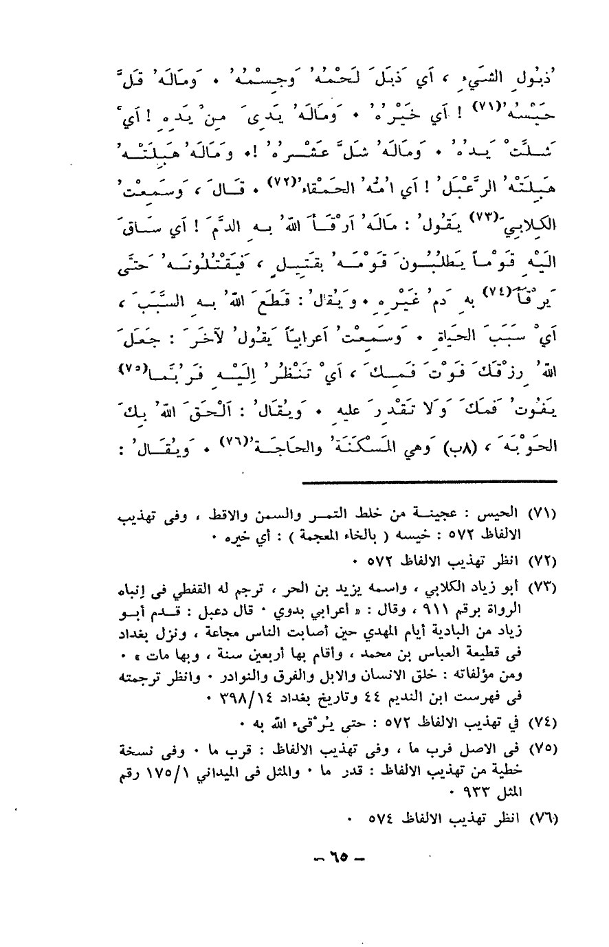 ذُبول الشيء، أي ذَبَلَ لَحمُه وجِسمُه. وما له قَلَّ حَيْسُه! أي خيرُه. وما له يَدِيَ مِن يَدِه! أي شَلّت يدُه. وما له شَلَّ عَشرُه! وما له هَبِلَتْه [تكررت خطأ] الرَّعْبَلُ! أي أمُّه الحمقاء. قال [ابن السكيت]: وسمعت الكلابي [جعله المحقق أبا زياد الكلابي، والصواب أنه أبو صاعد الكلابي؛ لأن الأول متقدم أخذ عنه الكسائي والفراء وطبقتهما، وأما أبو صاعد فمتأخر يحكي عنه ابن السكيت كثيرا في إصلاح المنطق] يقول: ما له أرقأ اللهُ به الدمَ! أي ساق إليه قوما يطلبون قومه بقتيل، فيقتلونه حتى يَرقأَ به دمُ غيره. ويقال: قَطَع اللهُ به السببَ، أي سبب الحياة. وسمعتُ أعرابيا يقول لآخر: جعل الله رزقك فوتَ فمك، أي تنظر إليه فربما يفوتُ فمَك ولا تقدرُ عليه. ويقال: ألحقَ الله بك الحَوْبة، وهي المسكنة والحاجة. ويقال:
