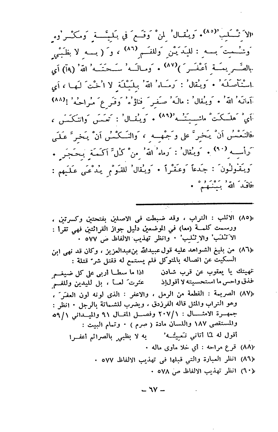 الإَِثْلَِب [بفتحتين معا أو بكسرتين معا]. ويقال لمن وقع في بلية ومكروه وشُمِت به: لِليدين وللفم، وبه لا بِظبي الصريمةِ أعفَرَ. وما له سحَتَه الله أي استأصله. ويقال: رماه الله بِليلةٍ لا أختَ لها، أي أماته الله. ويقال: ما له صَفِر فناؤه وقَرِع مُراحُه! أي هَلَكت ماشيتُه. ويقال: تَعِسَ [ضبطها المحقق بفتح العين] وانتكس، فالتَعْسُ أن يَخِر على وجهه، والنَكْسُ أن يخر على رأسه. ويقال: رماه الله من كل أَكَمة بِحَجَر. ويقولون: جَدْعًا وعقْرًا. ويقال للقوم يُدعى عليهم: فاقَدَ اللهُ بينهم.