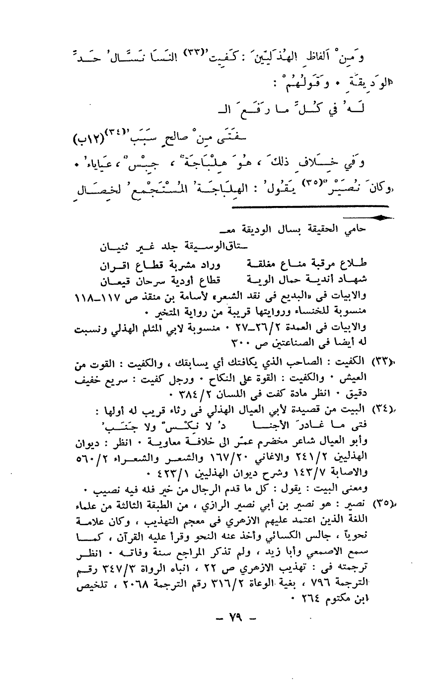ومن ألفاظ الهذليين: كَفِيتُ النَّسا نَسَّالُ حَدِّ الوديقة. وقولُهم: