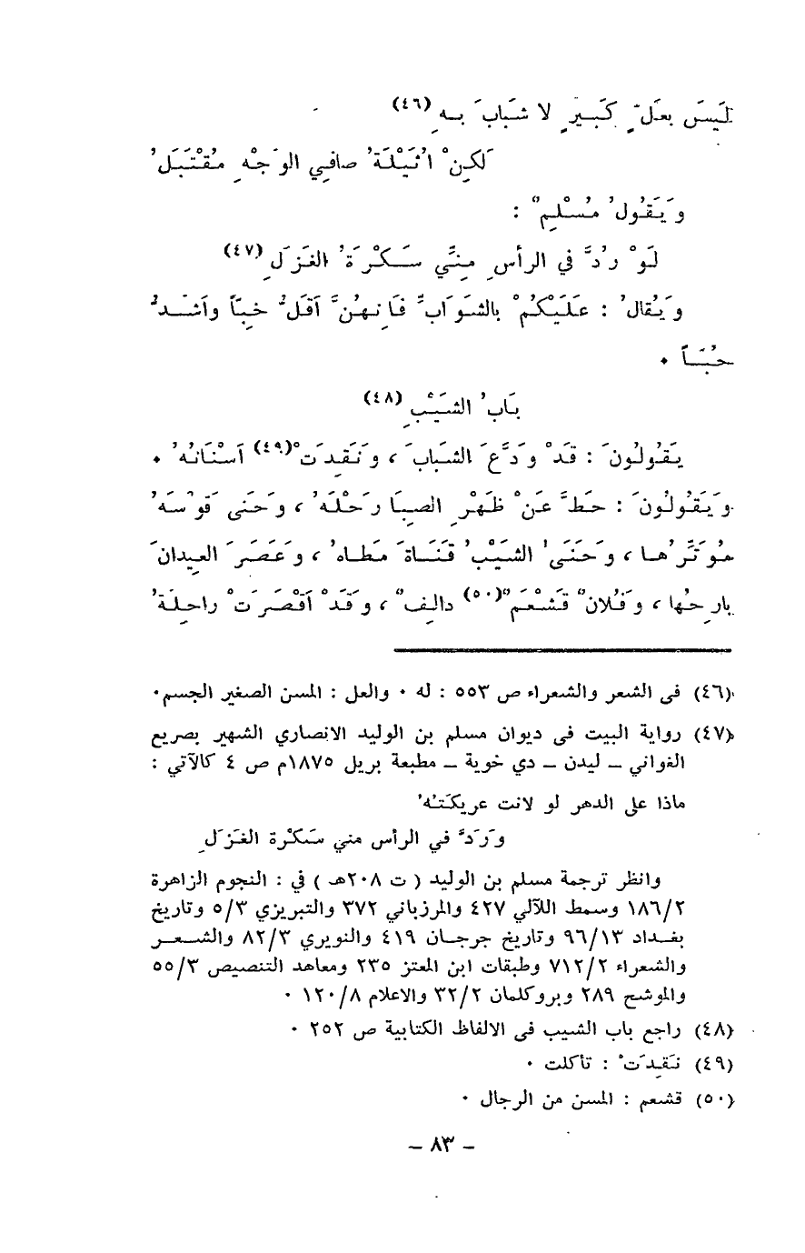 يقولون: قد وَدَّع الشبابَ، ونقِدت أسنانُه. ويقولون: حَطَّ عن ظهر الصِّبا رحلَه، وحنَى قوسَه موتِّرُها، وحنَى الشيبُ قناةَ مطاه، وعصَر العيدانَ بارِحُها، وفلانٌ قَشْعَمٌ دالفٌ، وقد أقصَرَتْ راحلةُ