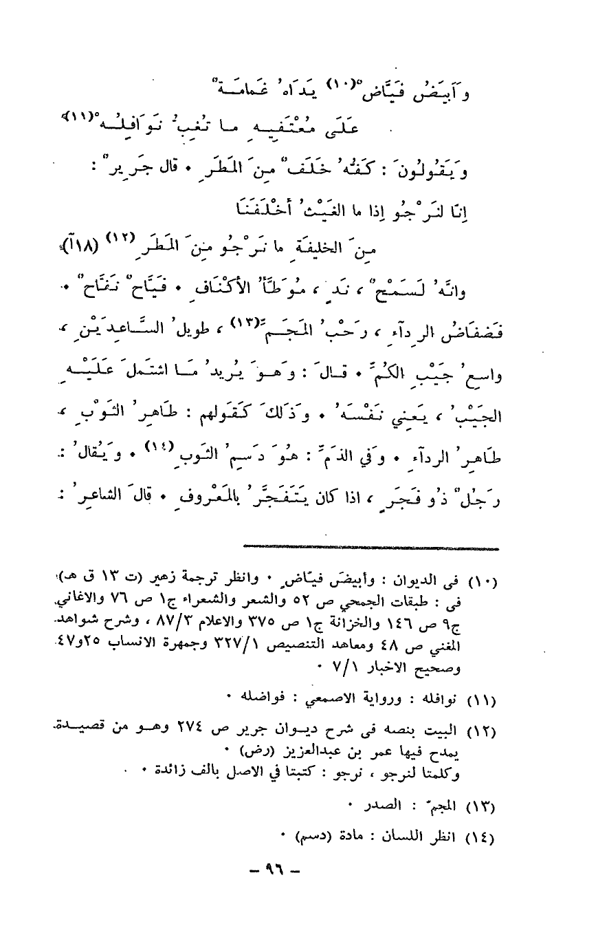 وإنه لسمحٌ، ندٍ، موطأُ الأكناف. فياحٌ نفاحٌ، فضفاض الرداء، رحبُ المَجَمِّ، طويلُ الساعدين، واسع جيبِ الكم. قال: وهو يريد ما اشتمل عليه الجيبُ، يعني نفسَه. وذلك كقولهم: طاهرُ الثوب، طاهر الرداء. وفي الذم: هو دَسِمُ الثوب. ويقال: رجل ذو فَجَر، إذا كان يتفجَّر بالمعروف. قال الشاعر:
