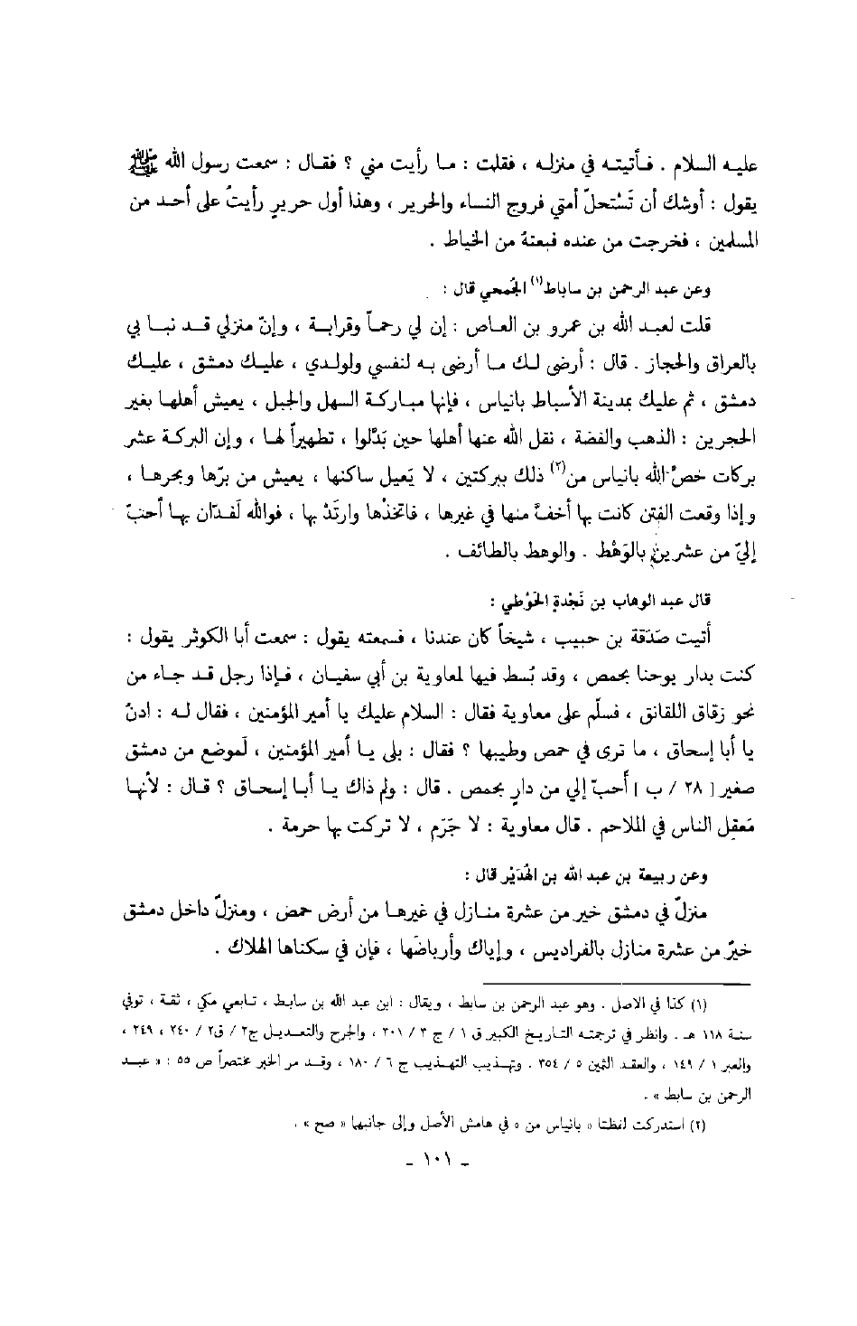 قلت لعبد الله بن عمرو بن العاص: إن لي رحماً وقرابة، وإن منزلي قد نبا بي بالعراق والحجاز. قال: أرضى لك ما أرضى به لنفسي ولولدي، عليك دمشق، عليك دمشق، ثم عليك بمدينة الأسباط بانياس، فإنها مباركة السهل والجبل، يعيش أهلها بغير الحجرين: الذهب والفضة، نقل الله عنها أهلها حين بدلوا، تطهيراً لها، وإن البركة عشر بركات خص الله بانياس من ذلك ببركتين، لا يعيل ساكنها، يعيش من برها وبحرها، وإذا وقعت الفتن كانت بها أخف منها في غيرها، فاتخذها وارتد بها، فوا لله لفدان بها أحب إلي من عشرين بالوهط. والوهط بالطائف.