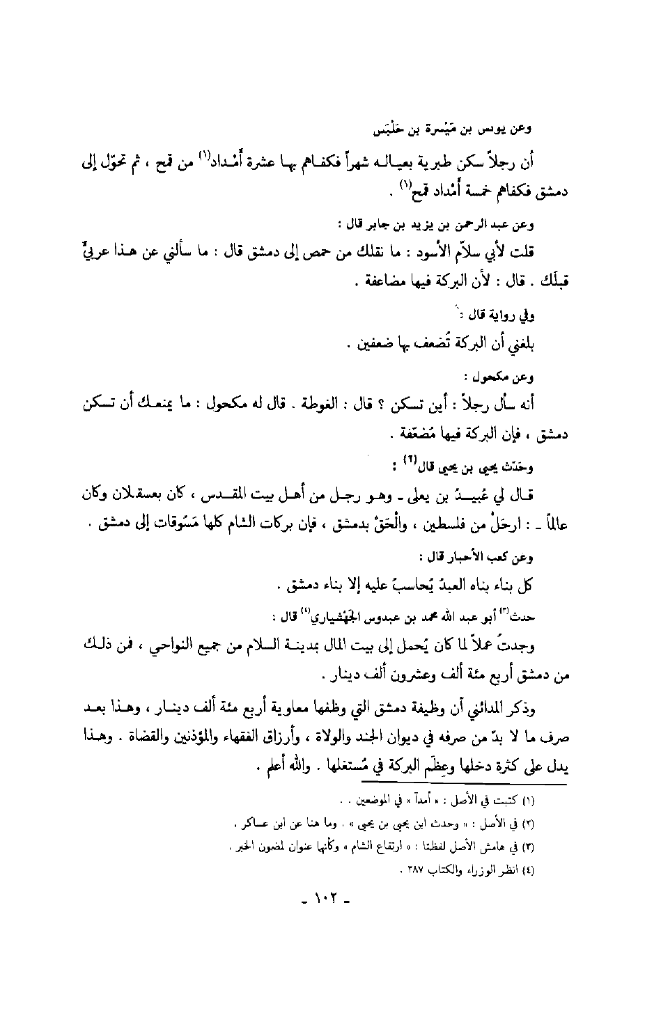 وذكر المدائني أن وظيفة دمشق التي وظفها معاوية أربع مئة ألف دينار، وهذا بعد صرف ما لا بد من صرفه في ديوان الجند والولاة، وأرزاق الفقهاء والمؤذنين والقضاة. وهذا يدل على كثرة دخلها وعظم البركة في مستغلها. والله أعلم.