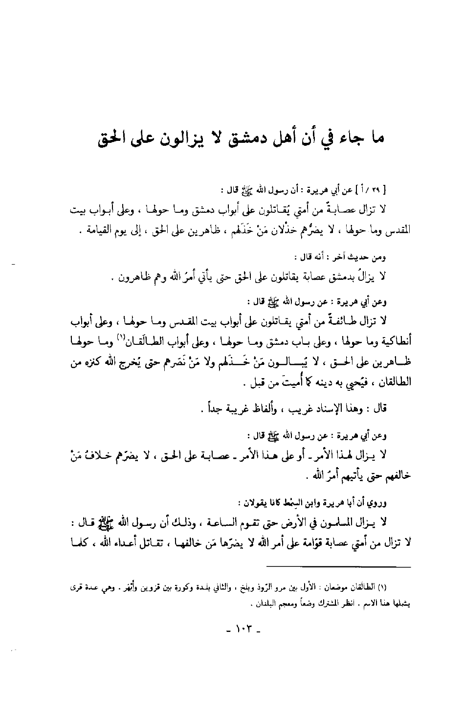 عن أبي هريرة: أن رسول الله صَلَّى اللهُ عَلَيْهِ وَسَلَّمَ قال: " لا تزال عصابة من أمتي يقاتلون على أبواب دمشق وما حولها، وعلى أبواب بيت المقدس وما حولها، لا يضرهم خذلان من خذلهم، ظاهرين على الحق، إلى يوم القيامة ".