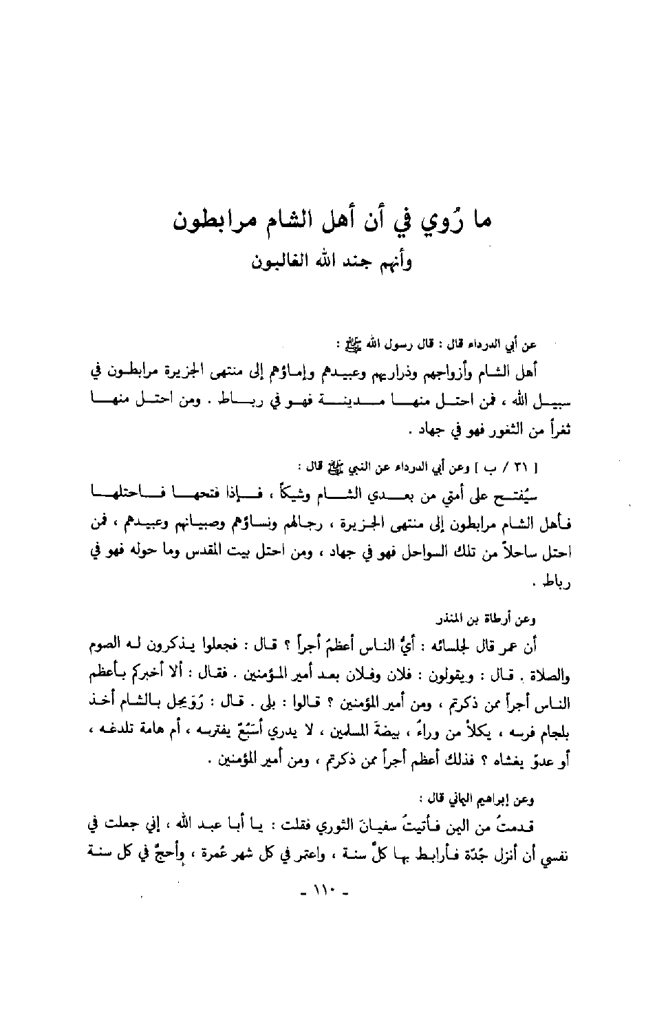 عن أبي الدرداء قال: قال رسول الله صَلَّى اللهُ عَلَيْهِ وَسَلَّمَ: " أهل الشام وأزواجهم وذراريهم وعبيدهم وإماؤهم إلى منتهى الجزيرة مرابطون في سبيل الله، فمن احتل منها مدينة فهو في رباط. ومن احتل منها ثغراً من الثغور فهو في جهاد ".