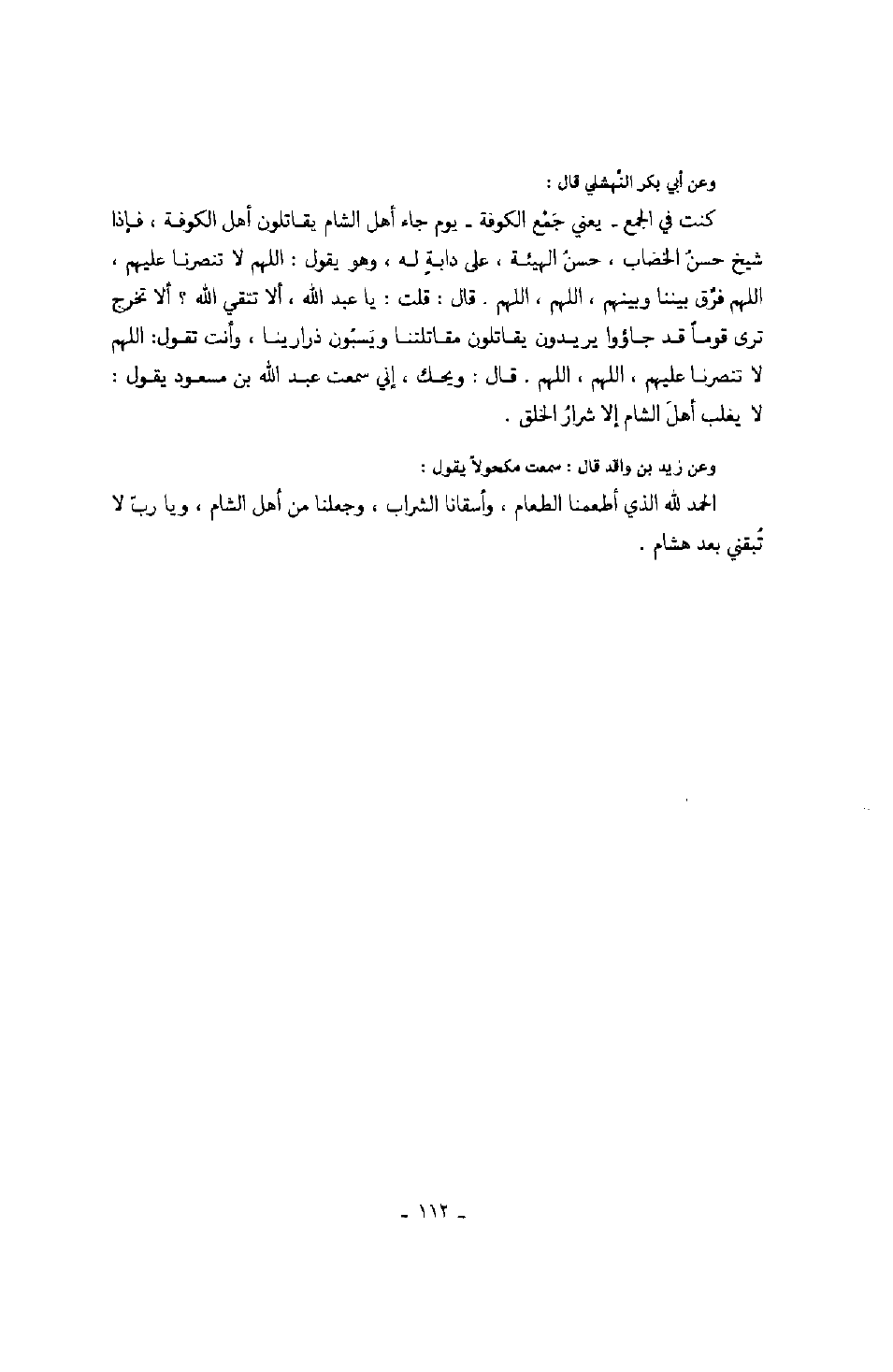 أبي كبر النهشلي قال: كنت في الجمع يعني جمع الكوفة يوم جاء أهل الشام يقاتلون أهل الكوفة، فإذا شيخ حسن الخضاب، حسن الهيئة، على دابة له، وهو يقول: اللهم لا تنصرنا عليهم، اللهم فرق بيننا وبينهم، اللهم، اللهم. قال: قلت: يا عبد الله، ألا تتقي الله؟ ألا تخرج ترى قوماً قد جاؤوا يريدون يقاتلون مقاتلتنا ويسبون ذرارينا، وأنت تقول: اللهم لا تنصرنا عليهم، اللهم، اللهم. قال: ويحك، إني سمعت عبد الله بن مسعود يقول: لا يغلب أهل الشام إلا شرار الخلق.