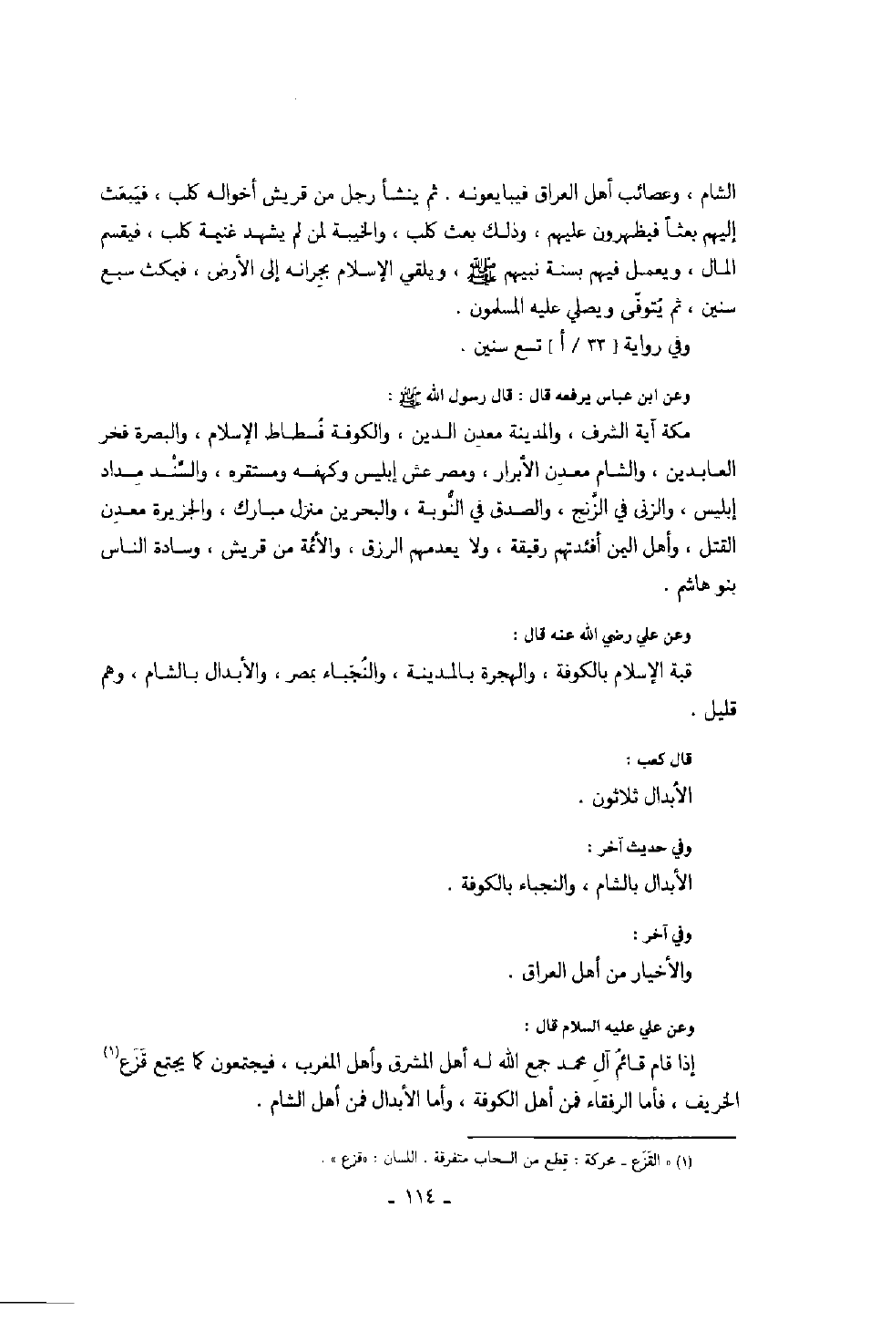 وعن علي رضي الله عنه قال: قبة الإسلام بالكوفة، والهجرة بالمدينة، والنجباء بمصر، والأبدال بالشام، وهم قليل.