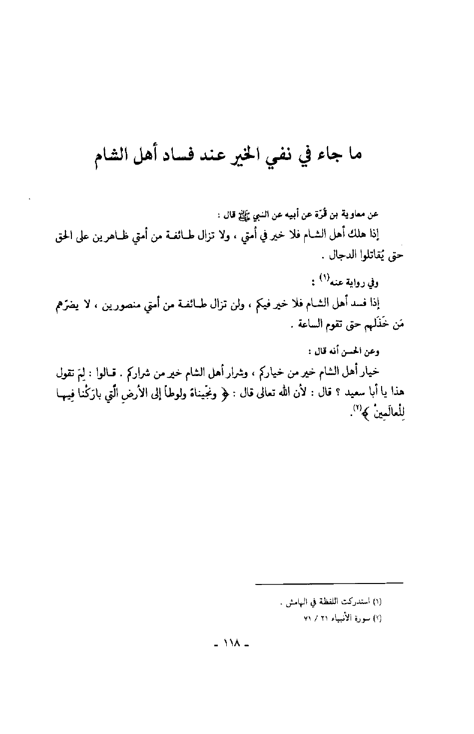 عن معاوية بن قمرة عن أبيه عن النبي صَلَّى اللهُ عَلَيْهِ وَسَلَّمَ قال: إذا هلك أهل الشام فلا خير في أمتي، ولا تزال طائفة من أمتي ظاهرين على الحق حتى يقاتلوا الدجال.