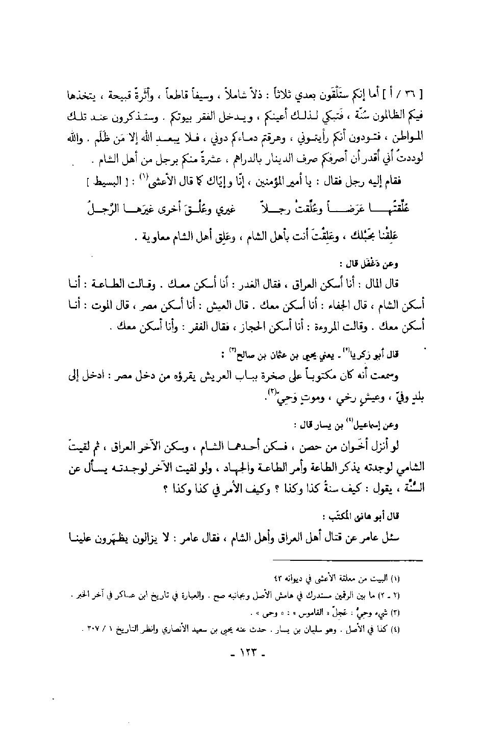 لو أنزل أخوان من حصن، فسكن أحدهما الشام، وسكن الآخر العراق، ثم لقيت الشامي لوجدته يذكر الطاعة وأمر الطاعة والجهاد، ولو لقيت الآخر لوجدته يسأل عن السنة، يقول: كيف سنة كذا وكذا؟ وكيف الأمر في كذا وكذا؟ قال أبو هانئ المكتب: سئل عامر عن قتال أهل العراق وأهل الشام، فقال عامر: لا يزالون يظهرون علينا