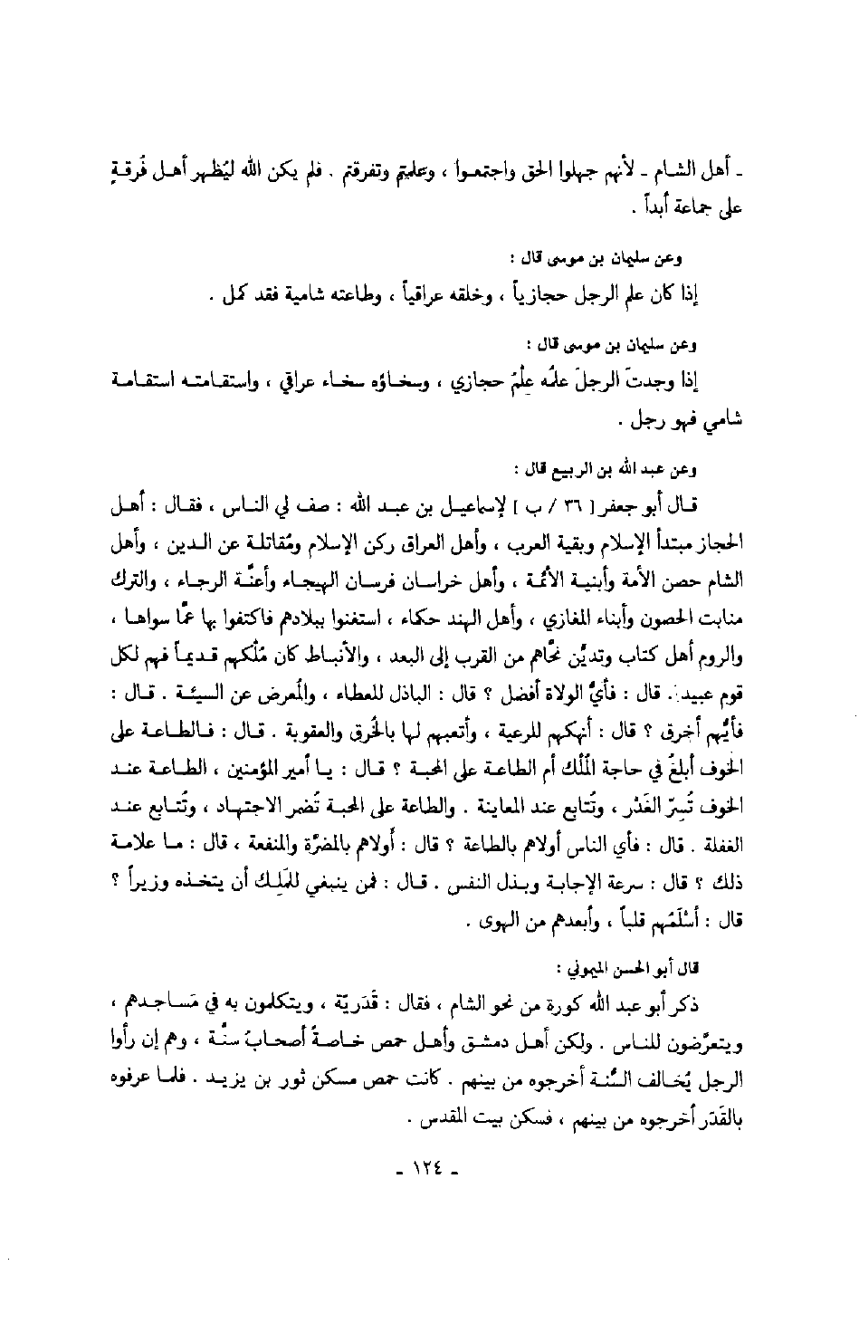 وعن سليمان بن موسى قال: إذا وجدت الرجل علمه علم حجازي، وسخاؤه سخاء عراقي، واستقامته استقامة شامي فهو رجل.