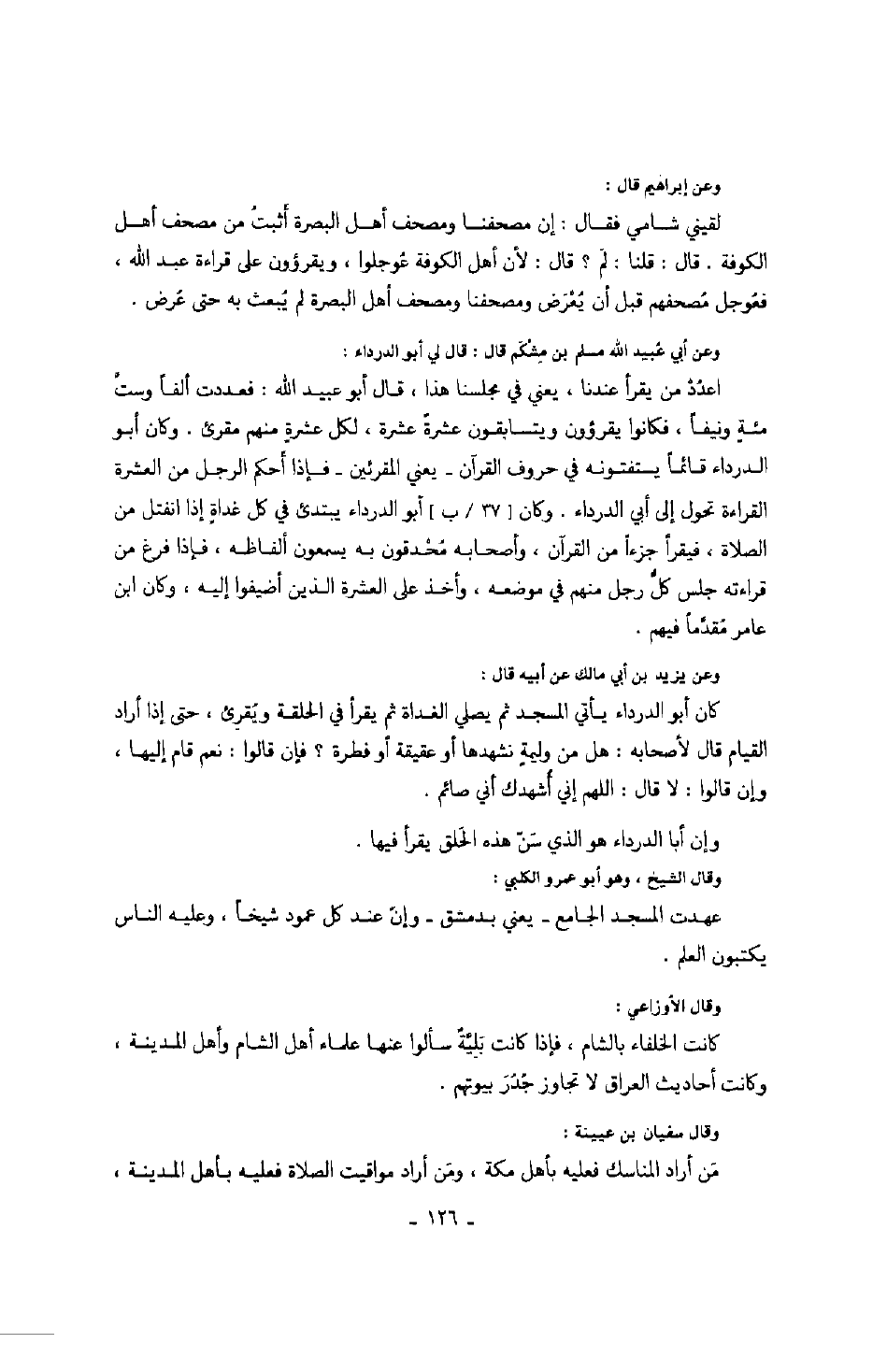 وعن إبراهيم قال: لقيني شامي فقال: إن مصحفنا ومصحف أهل البصرة أثبت من مصحف أهل الكوفة. قال: قلنا: لم؟ قال: لأن أهل الكوفة عوجلوا، ويقرؤون على قراءة عبد الله فعوجل مصحفهم قبل أن يعرض ومصحفنا ومصحف أهل البصرة لم يبعث به حتى عرض.