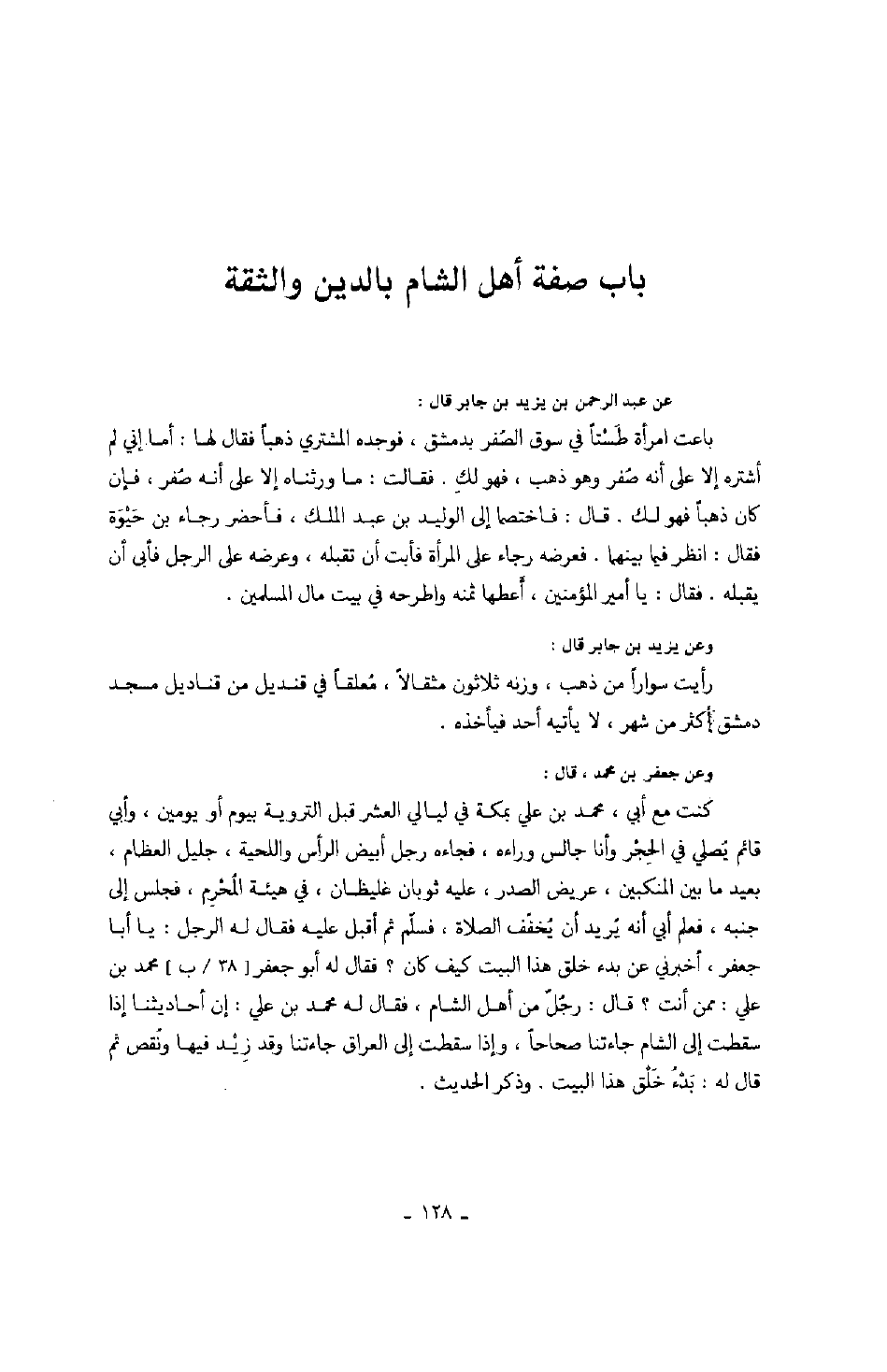 وعن جعفر بن محمد، قال: كنت مع أبي، محمد بن علي بمكة في ليالي العشر قبل التروية بيوم أو يومين، وأبي قائم يصلي في الحجر وأنا جالس وراءه، فجاءه رجل أبيض الراس واللحية، جليل العظام، بعيد ما بين المنكبين، عريض الصدر، عليه ثوبان غليظان، في هيئة المحرم، فجلس إلى جنبه، فعلم أبي أنه يريد أن يخفف الصلاة، فسلم ثم أقبل عليه فقال له الرجل: يا أبا جعفر، أخبرني عن بدء خلق هذا البيت كيف كان؟ فقال له أبو جعفر محمد بن علي ممن أنت؟ قال: رجل من أهل الشام، فقال له محمد بن علي: إن أحاديثنا إذا سقطت إلى الشام جاءتنا صحاحاً، وإذا سقطت إلى العراق جاءتنا وقد زيد فيها ونقص ثم قال له: بدء خلق هذا البيت. وذكر الحديث.
