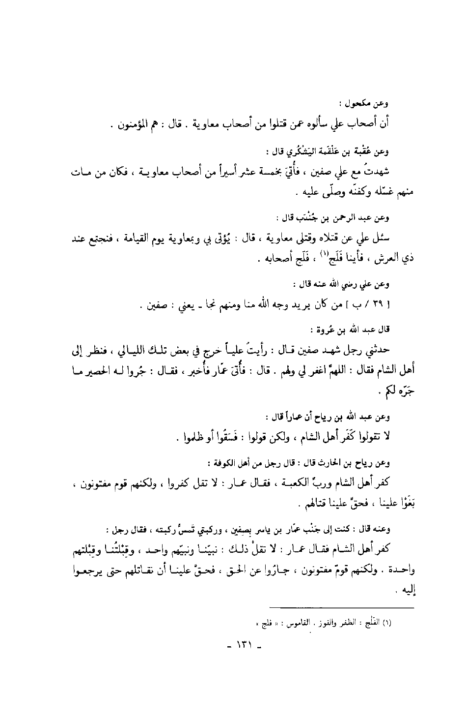 وعن عبد الرحمن بن جندب قال: سئل علي عن قتلاه وقتلى معاوية، قال: يؤتى بي وبمعاوية يوم القيامة، فنجتمع عند ذي العرض، فأينا فلج، فلج أصحابه.