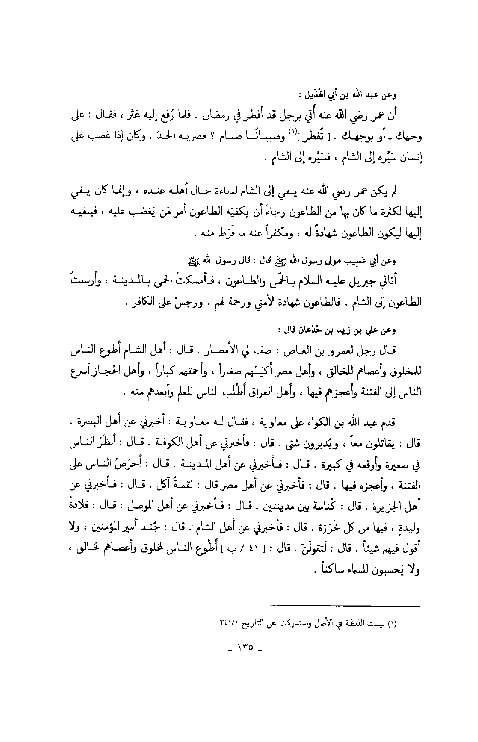 وعن علي بن زيد بن جدعان قال: قال رجل لعمرو بن العاص: صف لي الأمصار. قال: أهل الشام أطوع الناس للمخلوق وأعصاهم للخالق، وأهل مصر أكيسهم صغاراً، وأحمقهم كباراً، وأهل الحجاز أسرع الناس إلى الفتنة وأعجزهم فيها، وأهل العراق أطلب الناس للعلم وأبعدهم منه.