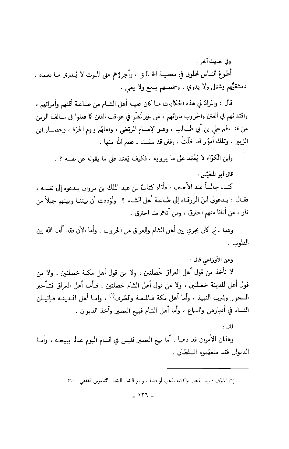 وعن الأوزاعي قال: لا نأخذ من قول أهل العراق خصلتين، ولا من قول أهل مكة خصلتين، ولا من قول أهل المدينة خصلتين، ولا من قول أهل الشام خصلتين: فأما أهل العراق فتأخير السحور وشرب النبيذ، وأما أهل مكة فالمتعة والصرف، وأما أهل المدينة فإتيان النساء في أدبارهن والسماع، وأما أهل الشام فبيع العصير وأخذ الديون.