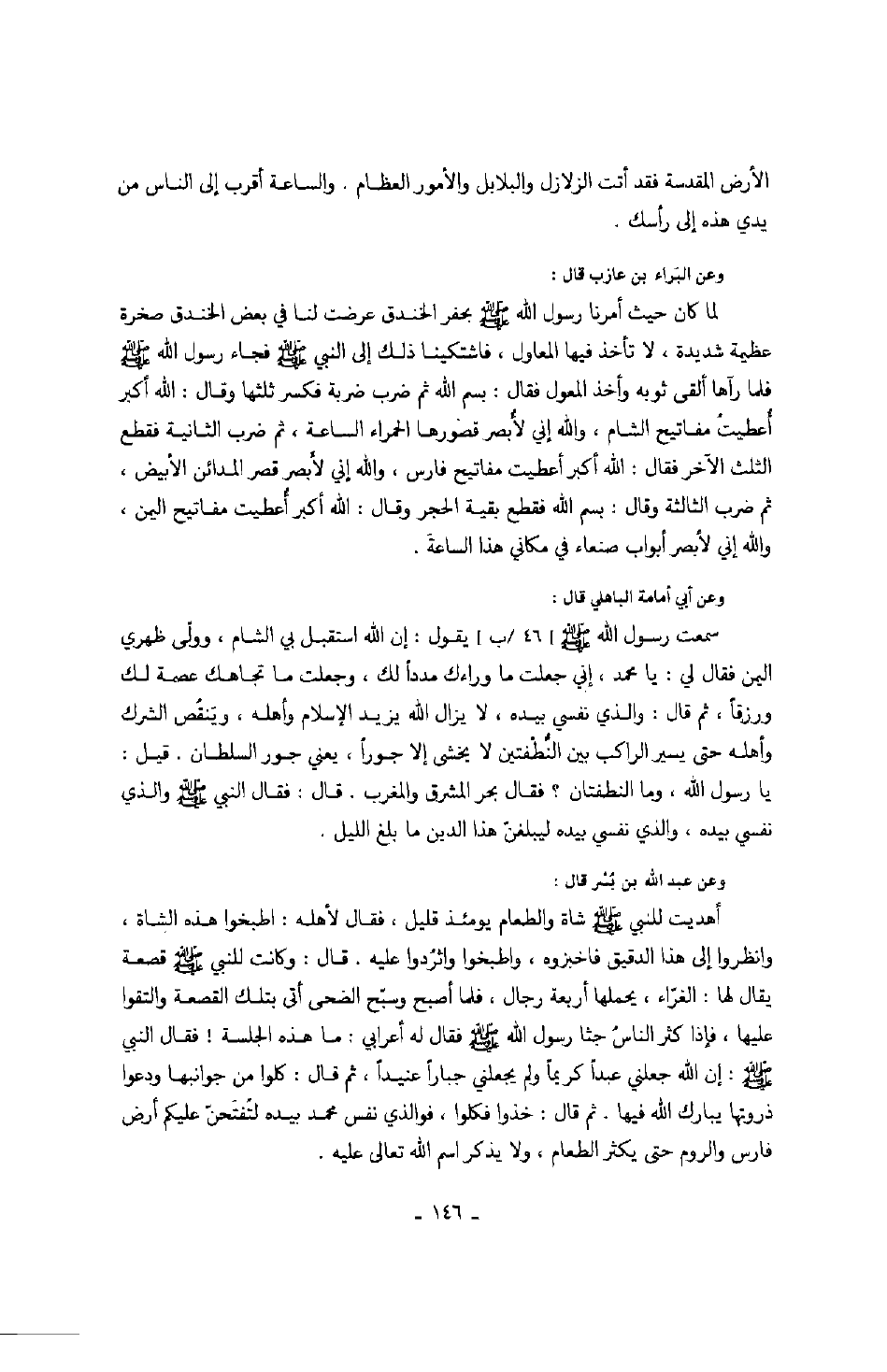 وعن البراء بن عازب قال: لما كان حيث أمرنا رسول الله صَلَّى اللهُ عَلَيْهِ وَسَلَّمَ بحفر الخندق عرضت لنا في بعض الخندق صخرة عظيمة شديدة، لا تأخذ فيها المعاول، فاشتكينا ذلك إلى النبي صَلَّى اللهُ عَلَيْهِ وَسَلَّمَ فجاء رسول الله صَلَّى اللهُ عَلَيْهِ وَسَلَّمَ فلما رآها ألقى ثوبه وأخذ المعول فقال: بسم الله ثم ضرب ضربة فكسر ثلثها وقال: الله أكبر أعطيت مفاتيح الشام، والله إني لأبصر قصورها الحمراء الساعة، ثم ضرب الثالثة وقال: بسم الله فقطع بقية الحجر وقال: الله أكبر أعطيت مفاتيح اليمن، والله إني لأبصر أبواب صنعاء في كاني هذا الساعة.