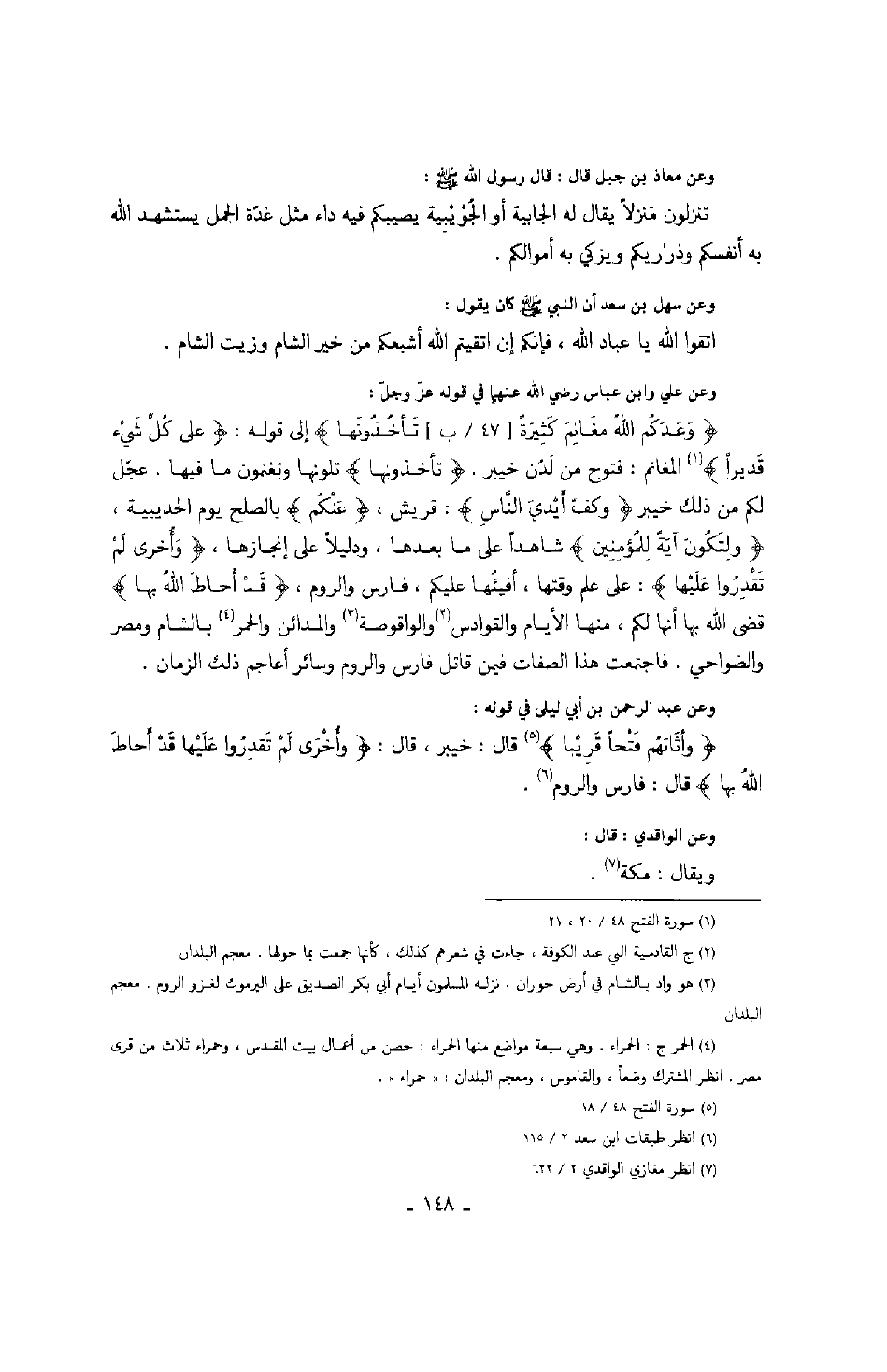 وعن علي وابن عباس رضي الله عنهما في قوله عز وجل: " وعدكم الله مغانم كثيرة تأخذونها " إلى قوله: على كل شيء قديراً " المغانم: فتوح من لدن خيبر. " تأخذونها " تلونها وتغنمون ما فيها. عجل لكم من ذلك خيبر " وكف أيدي الناس ": قريش، " عنكم " بالصلح يوم الحديبة، " ولتكون آية للمؤمنين " شاهداً على ما بعدها، ودليلاً على إنجازها، " وأخرى لم تقدروا عليها ": على علم وقتها، أفيئها عليكم، فارس والروم، " قد أحاط الله بها " قضى الله بها أنها لكم، منها الأيام والقوادس والواقوصة والمدائن والحمر بالشام ومصر والضواحي. فاجتمعت هذا الصفات فيمن قاتل فارس والروم وسائر أعاجم ذلك الزمان.