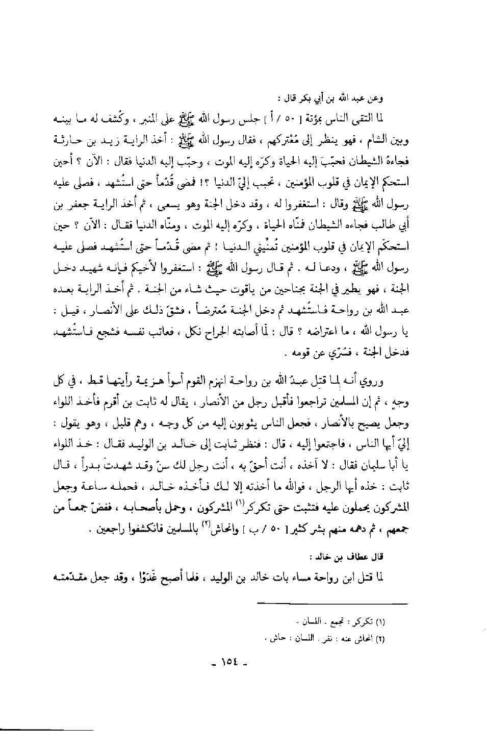 لما التقى الناس بمؤتة جلس رسول الله صَلَّى اللهُ عَلَيْهِ وَسَلَّمَ على المنبر، وكشف له ما بينه وبين الشام، فهو ينظر إلى معتركهم، فقال رسول الله صَلَّى اللهُ عَلَيْهِ وَسَلَّمَ: " أخذ الراية زيد بن حارثة فجاءه الشيطان فحبب إيه الحياة وكره إليه الموت، وحبب إليه الدنيا " فقال: الآن؟ أحين استحكم الإيمان في قلوب المؤمنين، تحبب إلي الدنيا؟! فمضى قدماً حتى استشهد، فصلى عليه رسول الله صَلَّى اللهُ عَلَيْهِ وَسَلَّمَ وقال: استغفروا له، وقد دخل الجنة وهو يسعى، ثم أخذ الراية جعفر بن أبي طالب فجاءه الشيطان فمناه الحياة، وكره إليه الموت، ومناه الدنيا فقال: الآن؟ حين استحكم الإيمان في قلوب المؤمنين تمنيني الدنيا! ثم مضى قدماً حتى استشهد فصلى عليه رسول الله صَلَّى اللهُ عَلَيْهِ وَسَلَّمَ، ودعا له. ثم قال رسول الله صَلَّى اللهُ عَلَيْهِ وَسَلَّمَ: " استغفروا لأخيكم فإنه شهيد دخل الجنة، فهو يطير في الجنة بجناحين من ياقوت حيث شاء من الجنة ". ثم أخذ الراية بعده عبد الله بن رواحة فاستشهد ثم دخل الجنة معترضاً، فشق ذلك على الأنصار، قيل: يا رسول الله، ما اعتراضه؟ قال: لما أصابته الجراح نكل، فعاتب نفسه فشجع فاستشهد فدخل الجنة، فسري عن قومه.