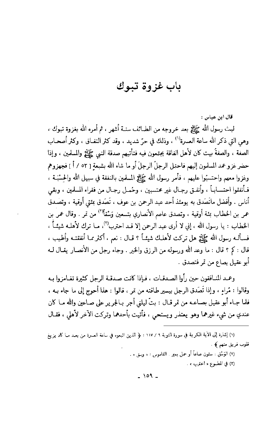 قال ابن عباس: لبث رسول الله صَلَّى اللهُ عَلَيْهِ وَسَلَّمَ بعد خروجه من الطائف ستة أشهر، ثم أمره الله بغزوة تبوك، وهي التي ذكر الله ساعة العسرة، وذلك في حر شديد، وقد كثر النفاق، وكثر أصحاب الصفة، والصفة بيت كان لأهل الفاقة يجتمعون فيه فتأتيهم صدقة النبي صَلَّى اللهُ عَلَيْهِ وَسَلَّمَ والمسلمين، وإذا حضر غزو عمد المسلمون إليهم فاحتمل الرجل الرجل أو ما شاء الله بشبعة فجهزوهم وغزوا معهم واحتسبوا عليهم، فأمر رسول الله صَلَّى اللهُ عَلَيْهِ وَسَلَّمَ المسلمين بالنفقة في سبيل الله والحسبة، فأنفقوا احتساباً، وأنفق رجال غير محتسبين، وحمل رجال من فقراء المسلمين، وبقي أناس. وأفضل ما تصدق به يومئذ أحد عبد الرحمن بن عوف، تصدق بمئتي أوقية، وتصدق عمر بن الخطاب بمئة أوقية، وتصدق عاصم الأنصاري بتسعين وسقاً من تمر. وقال عمر بن الخطاب: يا رسول الله، إني لا أرى عبد الرحمن إلا قد اترب، ما ترك لأهله شيئاً، فسأله رسول الله صَلَّى اللهُ عَلَيْهِ وَسَلَّمَ هل تركت لأهلك شيئاً؟ قال: نعم، أكثر مما أنفقته وأطيب، قال: كم؟ قال: ما وعد الله ورسوله من الرزق والخير. وجاء رجل من الأنصار يقال له أبو عقيل بصاع من تمر فتصدق.