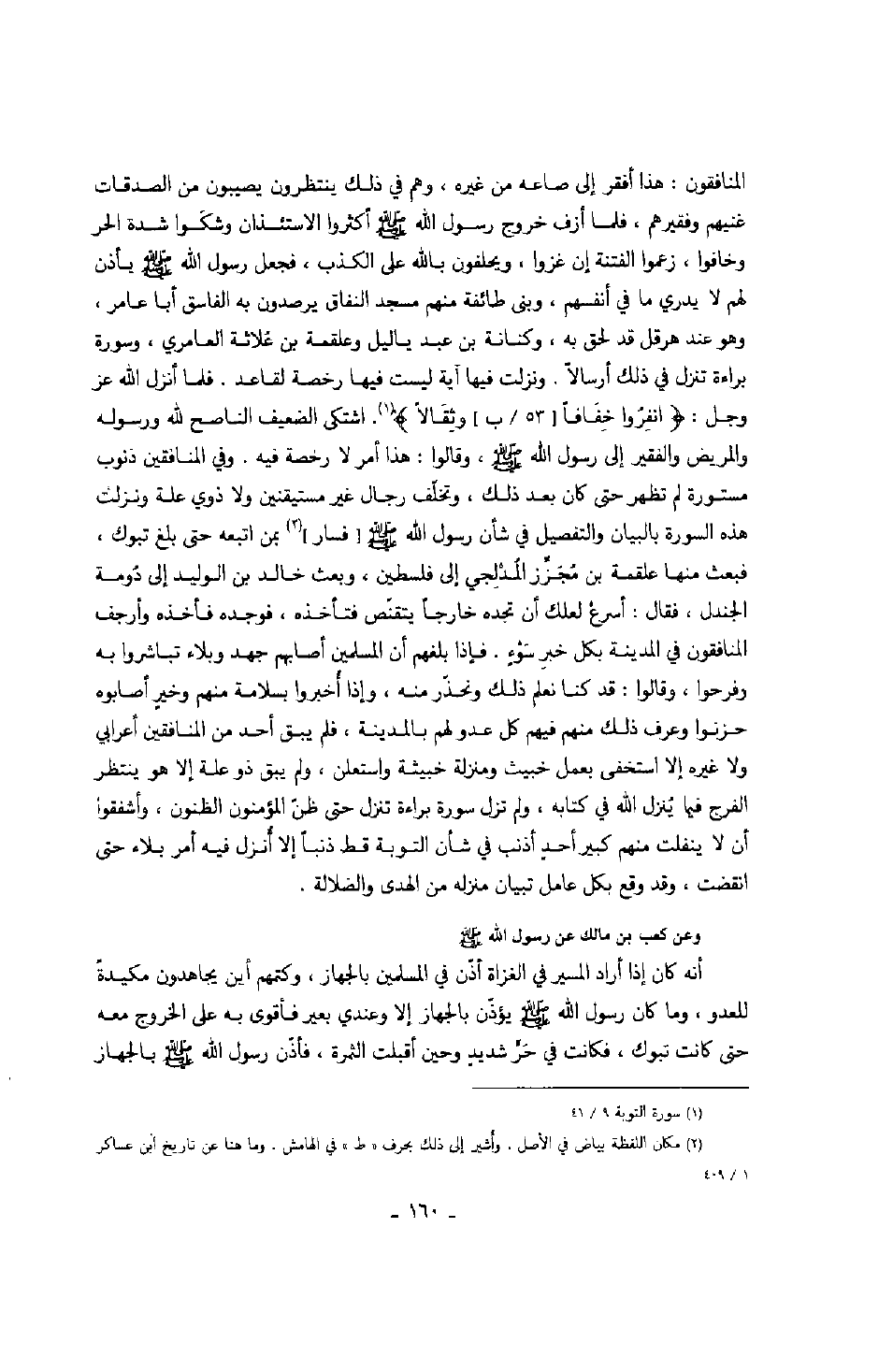 المنافقون: هذا أفقر إلى صاعه من غيره، وهم في ذلك ينتظرون يصيبون من الصدقات غنيهم وفقيرهم، فلما أزف خروج رسول الله صَلَّى اللهُ عَلَيْهِ وَسَلَّمَ أكثروا الاستئذان وشكوا شدة الحر وخافوا، زعموا الفتنة إن غزوا، ويحلفون بالله على الكذب، فجعل رسول الله صَلَّى اللهُ عَلَيْهِ وَسَلَّمَ يأذن لهم لا يدري ما في أنفسهم، وبنى طائفة منهم مسجد النفاق يرصدون به الفاسق أبا عامر، وهو عند هرقل قد لحق به، وكنانة بن عبد ياليل وعلقمة بن علاثة العامري، وسورة براءة تنزل في ذلك أرسالاً. ونزلت فيها آية ليست فيها رخصة لقاعد. فلما أنزل الله عز وجل: " انفروا خفافاً وثقالاً ". اشتكى الضعيف الناصح لله ورسوله والمريض والفقير إلى رسول الله صَلَّى اللهُ عَلَيْهِ وَسَلَّمَ، وقالوا: هذا أمر لا رخصة فيه. وفي المنافقين ذنوب مستورة لم تظهر حتى كان بعد ذلك، وتخلف رجال غير مستيقنين ولا ذوي علة ونزلت هذه السورة بالبيان والتفصيل في شأن رسول اله صَلَّى اللهُ عَلَيْهِ وَسَلَّمَ فسار بمن اتبعه حتى بلغ تبوك، فبعث منها علقمة بن مجزز المدلجي إلى فلسطين، وبعث خالد بن الوليد إلى دومة الجندل، فقال: أسرع لعلك أن تجده خارجاً يتقنص فتأخذه، فوجده فأخذه وأرجف المنافقون في المدينة بكل خبر سوء. فإذا بلغهم أن المسلمين أصابهم جهد وبلاء تباشروا به وفرحوا، وقالوا: قد كنا نعلم ذلك ونحذر منه، وإذا أخبروا بسلامة منهم وخير أصابوه حزنوا وعرف ذلك منهم فيهم كل عدو لهم بالمدينة، فلم يبق أحد من المنافقين أعرابي ولا غيره إلا استخفى بعمل خبيث ومنزلة خبيثة واستعلن، ولم يبق ذو علة إلا هو ينتظر الفرج فيما ينزل الله في كتابه، ولم تزل سورة براءة تنزل حتى ظن المؤمنون الظنون، وأشفقوا أن لا ينفلت منهم كبير أحد أذنب في شأن التوبة قط ذنباً إلا أنزل فيه أمر بلاء حتى انقضت، وقد وقع بكل عامل تبيان منزله من الهدى والضلالة.
